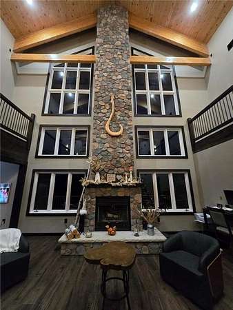 The dramatic great room serves as the centerpiece of the home, featuring soaring vaulted ceilings, exposed timber beams, and a stunning floor-to-ceiling stone fireplace framed by expansive windows capturing the surrounding landscape.