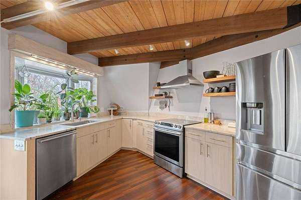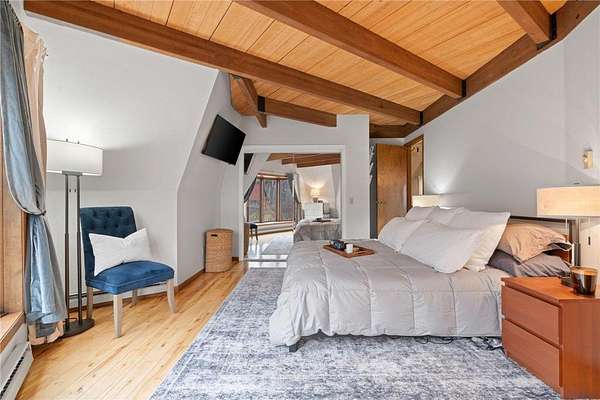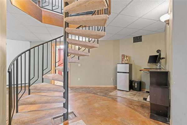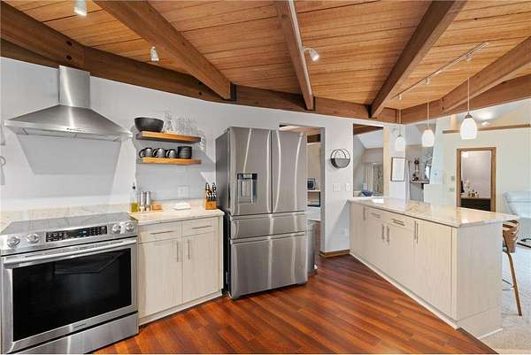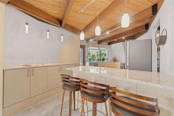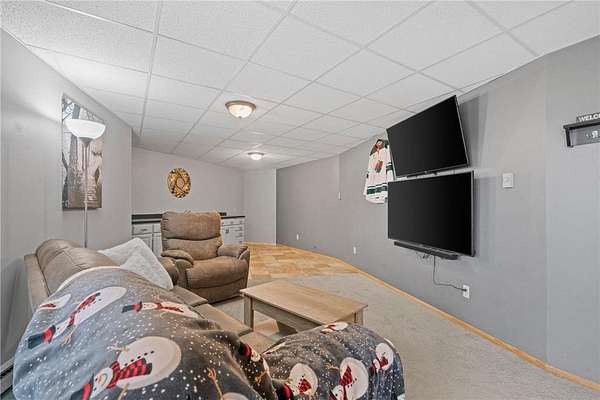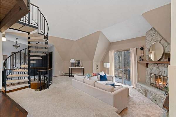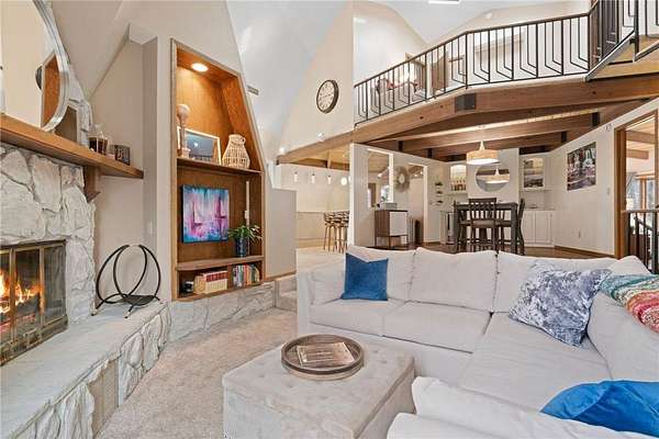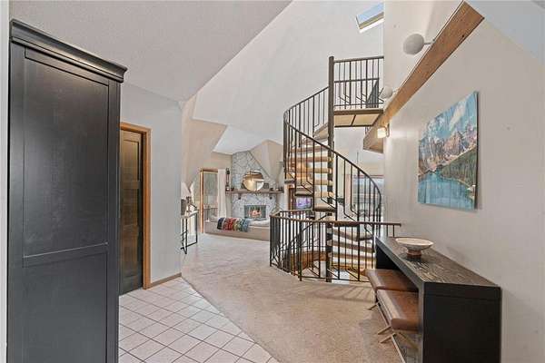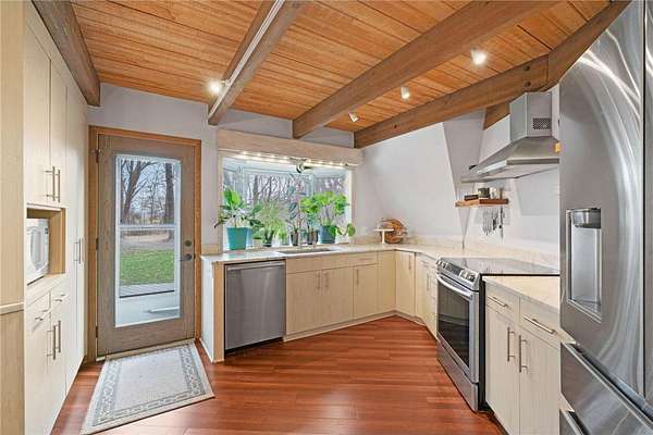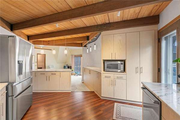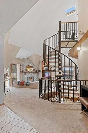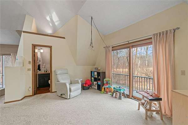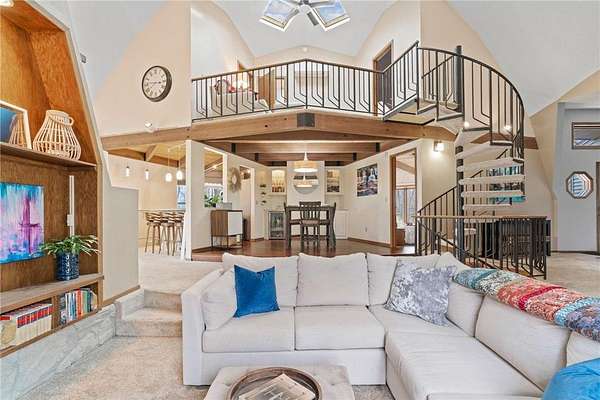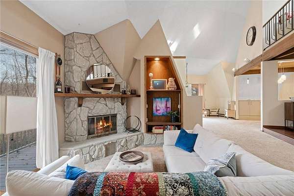 Thoughtful updates include freshly painted ceilings, a beautifully renovated custom kitchen designed for both style and function, and new slate flooring in the lower level. Expansive windows fill the home with natural light and frame panoramic views of the landscape in every season. The inviting living room, anchored by a wood-burning fireplace, creates a warm gathering space, especially during our chilly Minnesota winters.