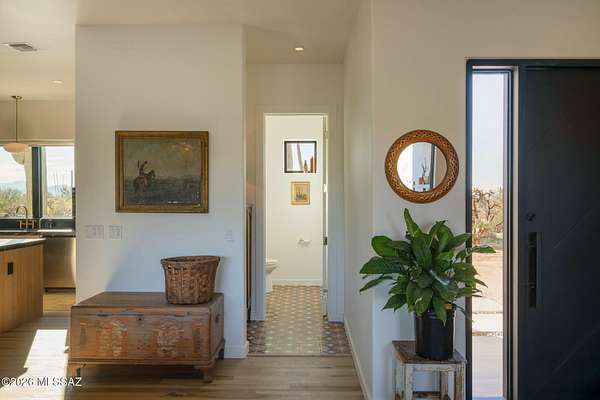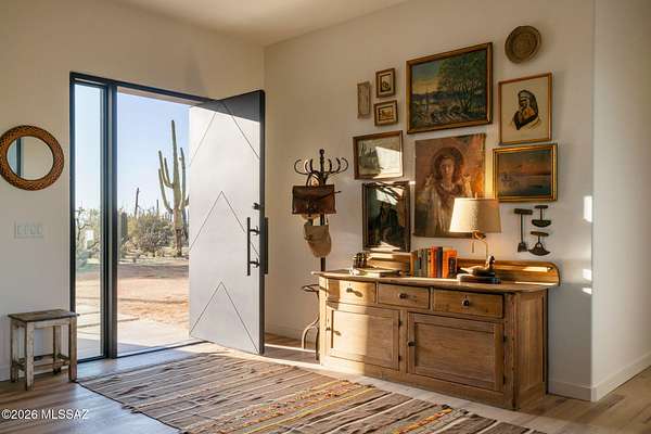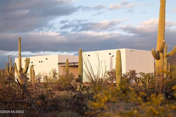 A new build nestled into the Sonoran Desert on Tucson's Westside. Eight acres of space, silence, and sky, with sunset views and long sightlines toward Saguaro National Park. Built in 2025, this is a property shaped around connection to land, to light, and to the easy rhythm of indoor and outdoor living. Tucked down a long dirt road, arriving home feels like a true retreat. The main residence is 2,373 SF with 3 bedrooms and 2.5 baths, designed for easy daily living and effortless hosting. At the heart of the home, the kitchen island anchors the plan, made for gathering, conversation, and slow mornings that stretch into the afternoon. A separate structure includes a 2-car garage and an 825 SF casita with 1 bedroom, 1 bath, and a living area, ideal for guests, creative work, or extended stays. Close enough to feel connected, separate enough to feel like its own hideaway. Both the main house and casita open to covered patios, extending living space into the desert and making the most of Tucson's best seasons. A commitment to performance is evident throughout: insulated walls with ZIP exterior insulation and rainscreen, a 30-year three-layer roof system, triple-pane windows, a 20 SEER HVAC system, high-efficiency hybrid electric water heaters, and a fully insulated garage with its own mini-split. Set near the Desert Museum, Saguaro National Park West, and JTH Tucson, this home offers immediate access to the landscape, miles of hiking, cycling, and riding trails, wide-open horizons, and the kind of quiet you can feel. With a separate casita and generous acreage, it is a natural fit as a primary residence, a multi-generational compound, or a flexible setup for guests and potential income generation. The property also lends itself beautifully as a horse property, with room to create the desert lifestyle you want. An elevated 9' x 16' pool will be completed prior to close, an ideal perch for sunset swims and star-filled nights.