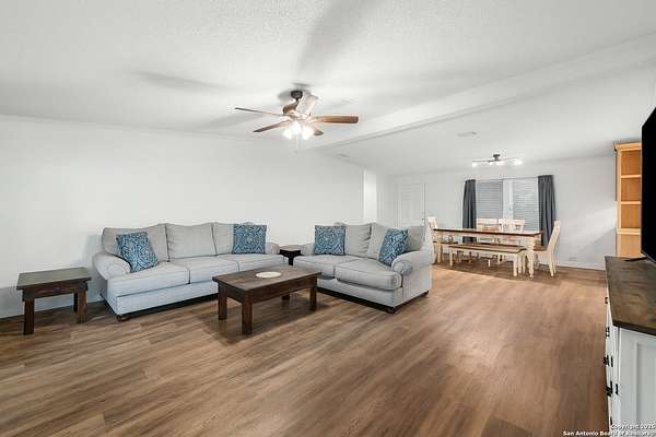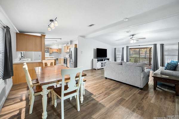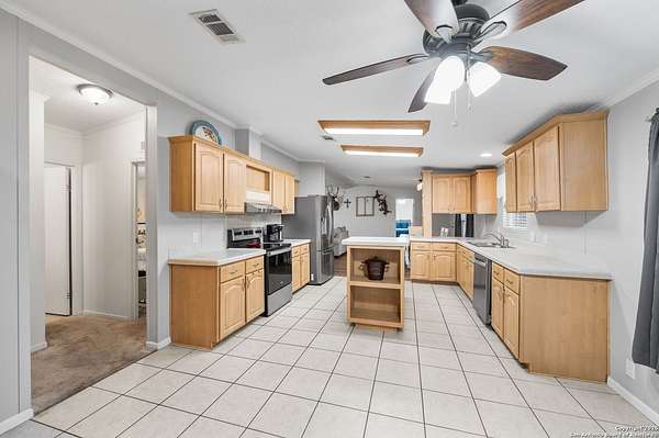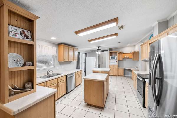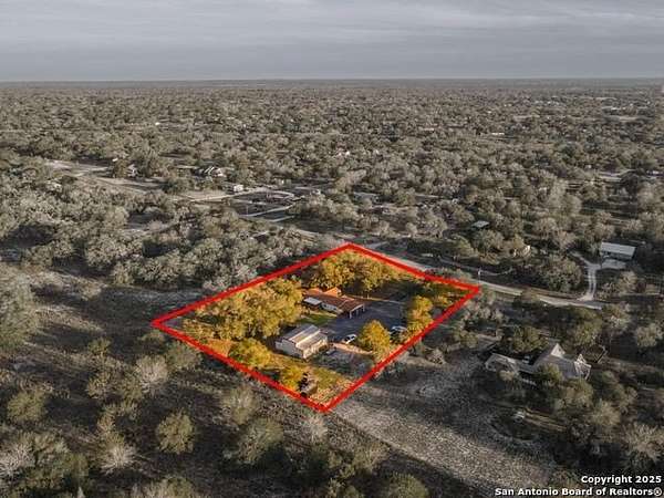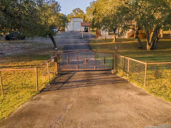 Enjoy peaceful country living on 2 acres in Floresville, TX. This well-maintained 3-bedroom, 2-bath home offers a split floorplan with the primary suite privately situated on one side of the home. The master retreat features a spacious walk-in closet and a full private bath. Two large secondary bedrooms sit on the opposite side, ideal for family, guests, or a home office setup. The home includes a bright breakfast nook, a dedicated dining room, and an inside laundry room with a walk-in pantry-providing excellent storage and everyday convenience. Outside, the property features an electric gated entry, paved driveway, asphalt parking, and covered porches in both the front and back. The backyard includes a sprinkler system for easy maintenance. A standout feature is the impressive 50x40 metal building, offering ample space for RVs, boats, or workshop activities and is climate-controlled with two mini-splits providing both heating and cooling. The shop includes a separate 12x40 storage area. Conveniently located just off Hwy 775 and 181.