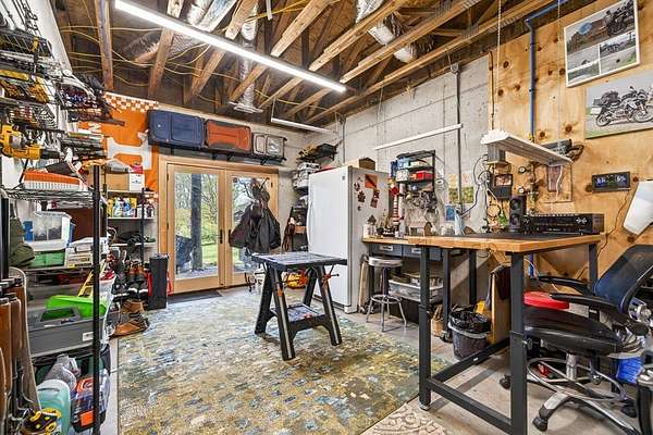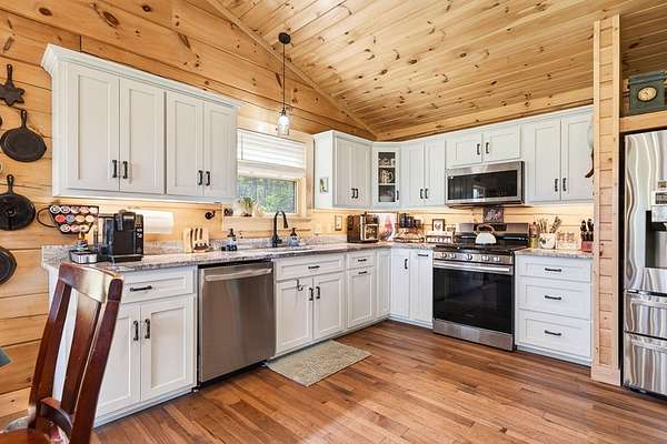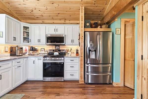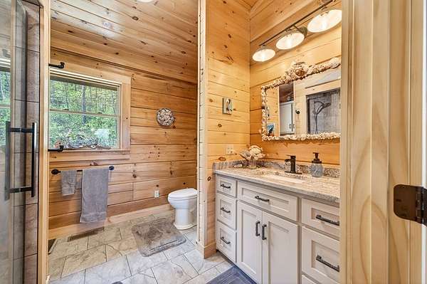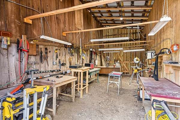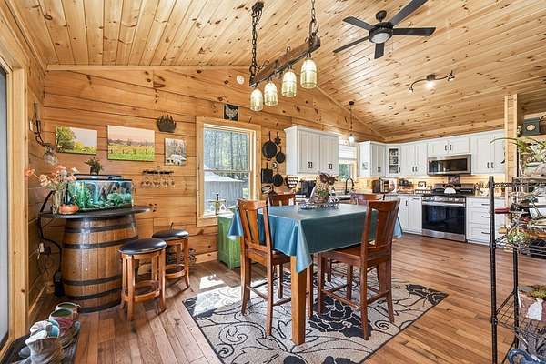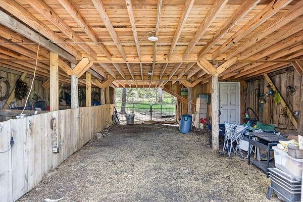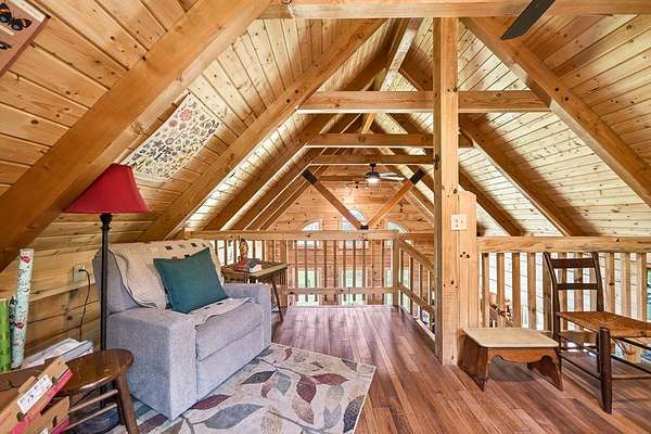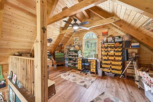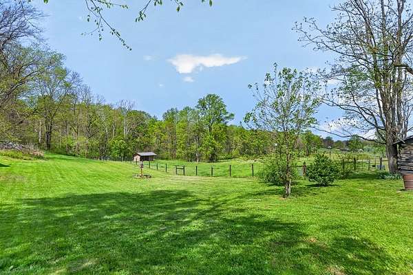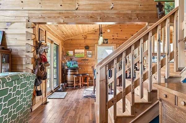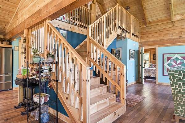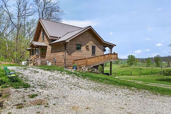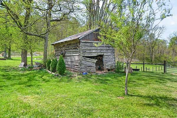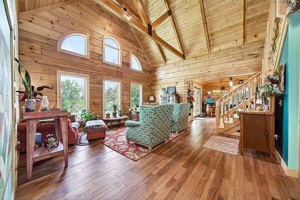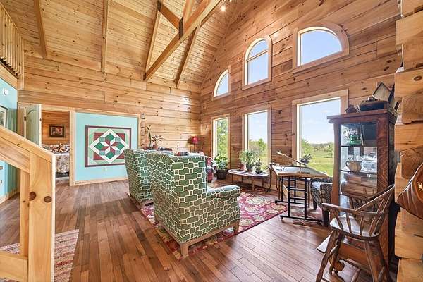 Exquisite 2024 Honest Abe "Castlerock" log home showcasing 2,480 sq ft of finely crafted living space (1,456 main + loft; 1,024 lower level, partially finished). The main level features rich hickory flooring, vaulted great room with dramatic floor-to-ceiling windows, and a beautifully appointed eat-in kitchen with stainless appliances, gas range, and granite countertops. The main-level primary suite offers bath with tiled walk-in shower and generous walk-in closets. A charming open loft provides a versatile space for a study, library, or guest accommodations. The lower level boasts 10 ft ceilings, poured walls, a spacious family room, bedroom, full bath, and unfinished space ideal for a workshop or storage. The grounds are equally impressive with fenced pasture, horse shed, and a refurbished barn featuring stalls, workshop, and loft. Additional highlights: Pella wdws and doors, Generac generator, hot tub, and fruit trees. A rare blend of luxury, functionality and country living.