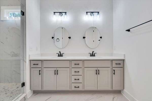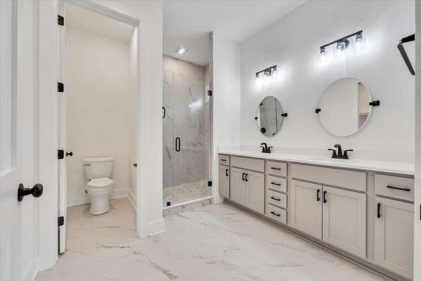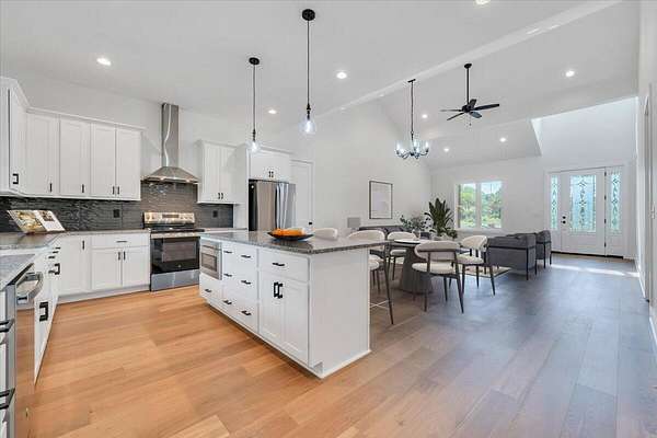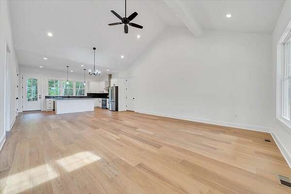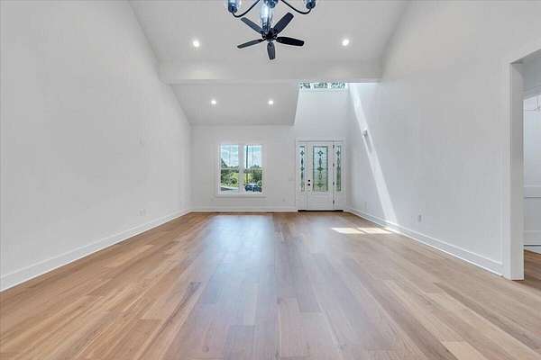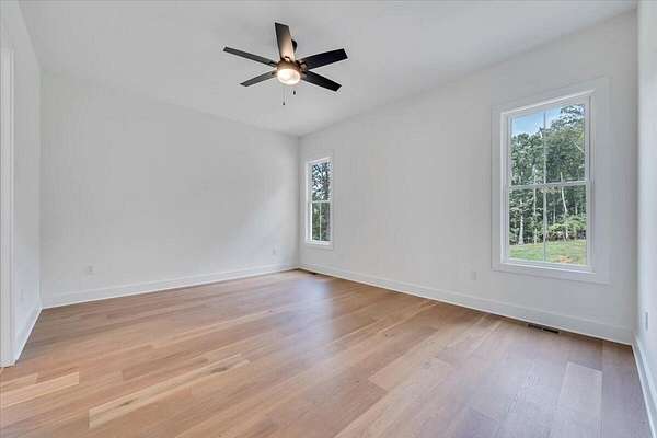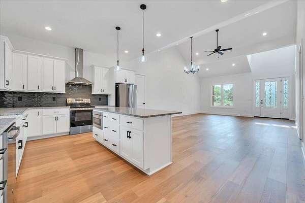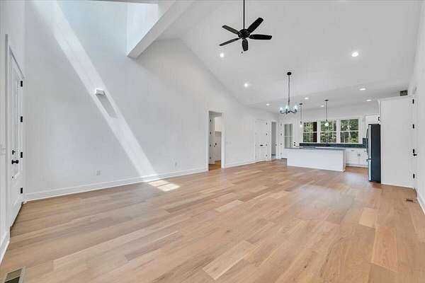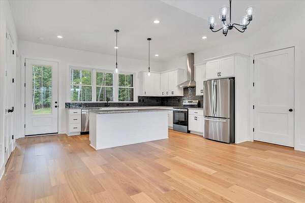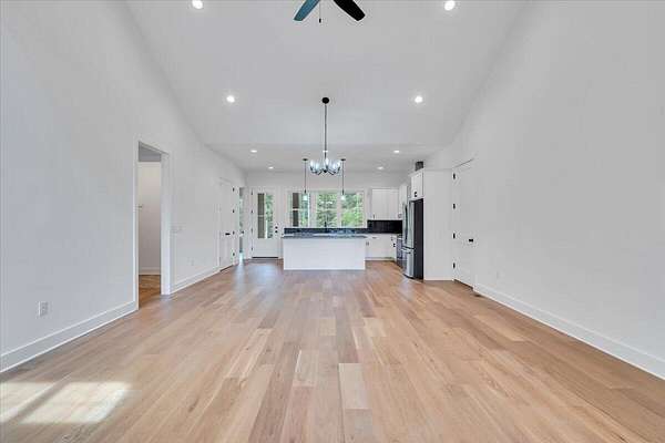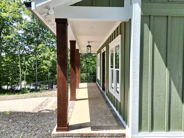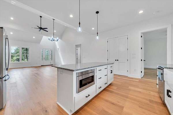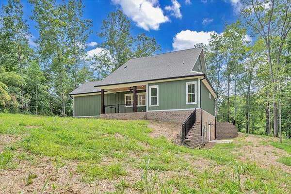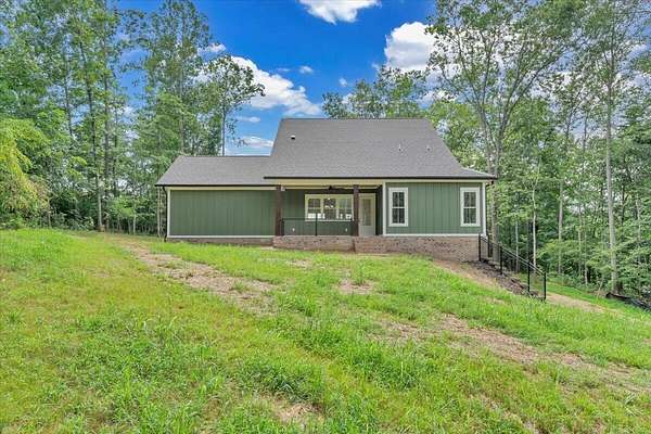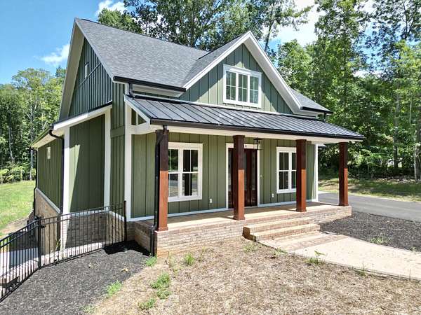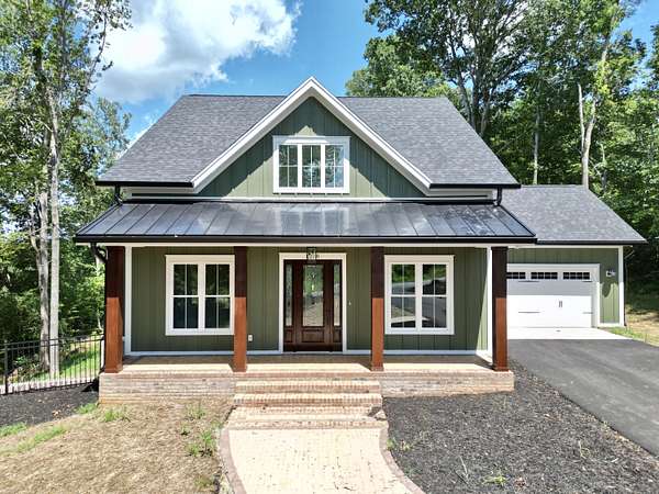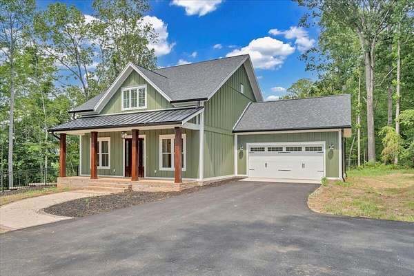 A brand new Custom Home with main-floor living, full of charm and fabulous curb appeal on 1.53 acres. Indoor features include a windowed cathedral ceiling in the main living area, 9-foot doors and 11 ft ceilings throughout. The kitchen includes multiple windows over the cast iron farmhouse sink, granite countertops, and tiled backsplash. An expansive island with overhang accommodates several barstools, pendant lighting, a microwave drawer, and plenty of storage space in the custom soft-close cabinetry. Additional features include a french-doored pantry, stainless steel appliances, and under-cabinet adjustable lighting. In the primary suite, enjoy tall windows, a beautifully tiled shower with glass doors, tiled floors, a custom cabinet with double vanity, and a walk-in closet. A separate laundry room is convenient to bedrooms. Engineered floors, solid-core doors, 6ft tilt-in vinyl clad windows, over-sized trim, 2 pull-down attic spaces for additional storage, modular manifold plumbing system. A full unfinished basement with 9 ft ceilings and third bedroom/bath in progress. Two poured concrete porches include stone pavers, standing-seam metal roofing, and wood-paneled ceilings. Outdoor features also include Miratec composite siding, a stone-paver sidewalk, retaining walls topped with black metal railings, a brick foundation, and a paved driveway leading into the two-car garage.