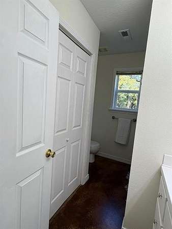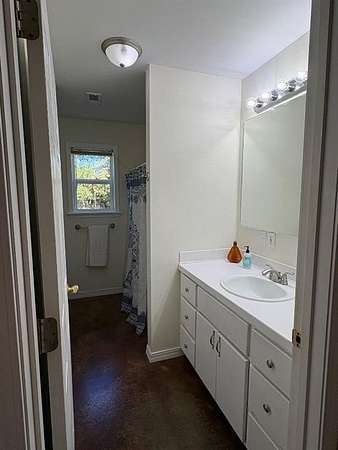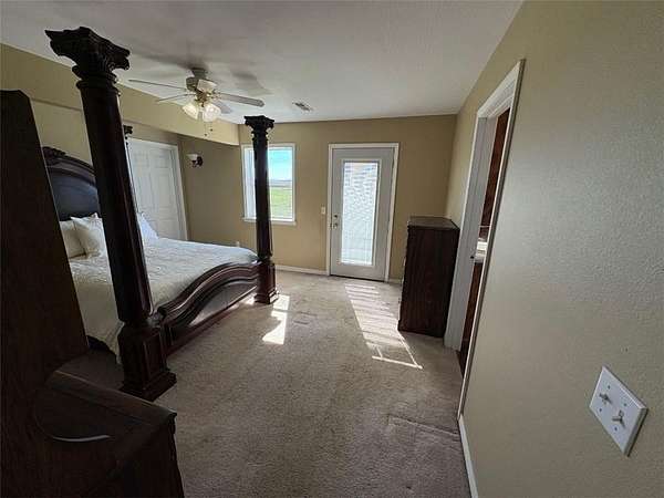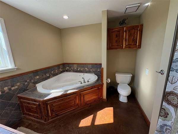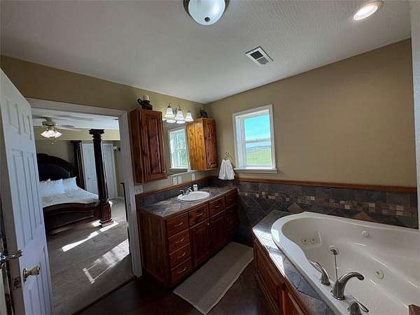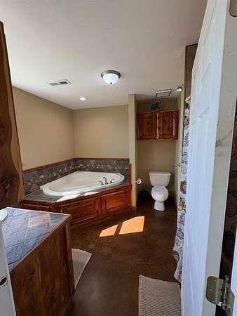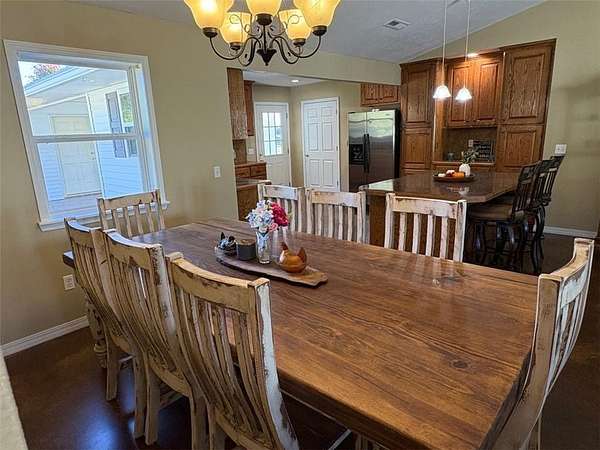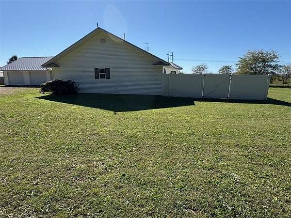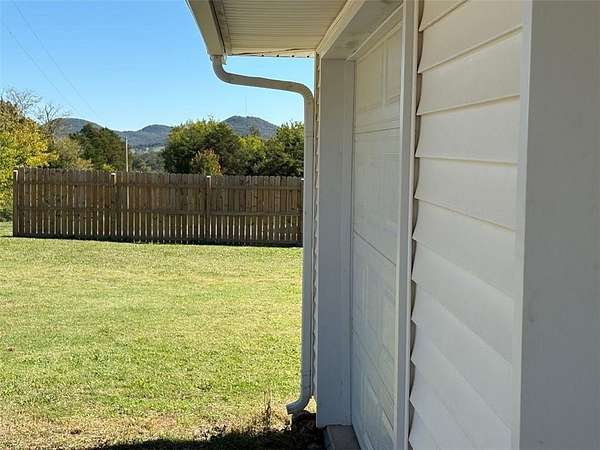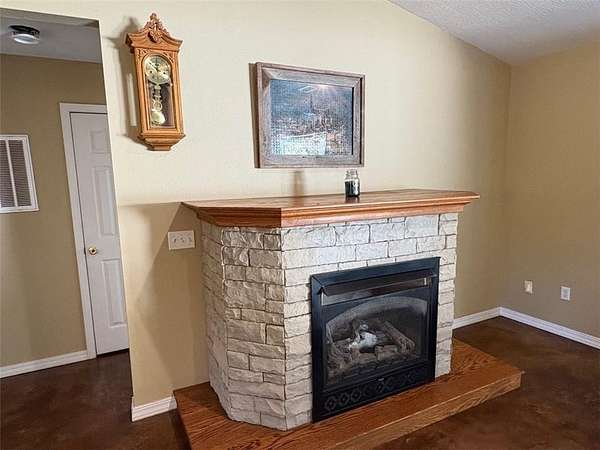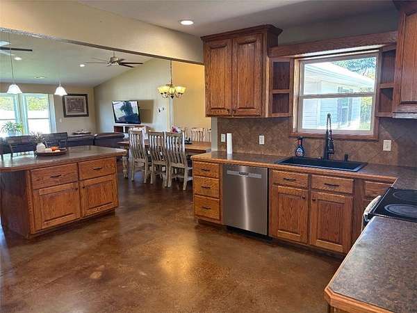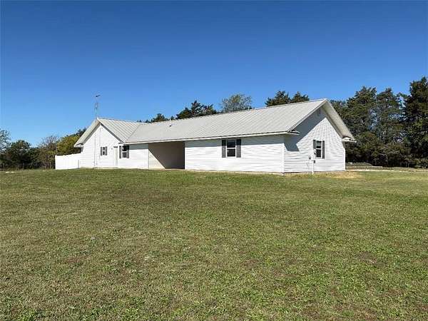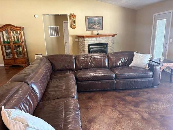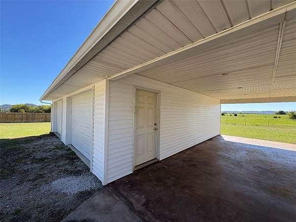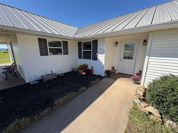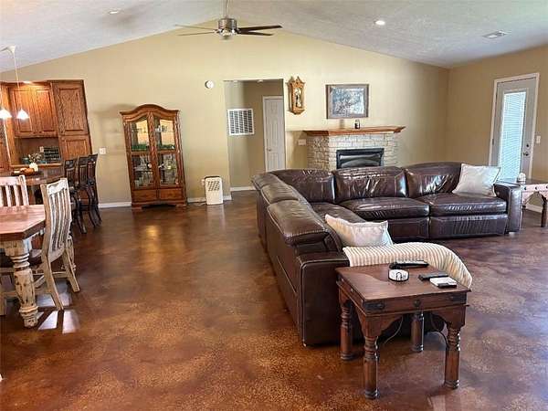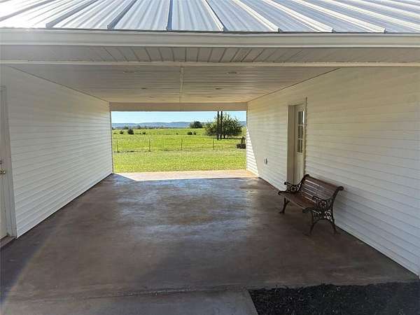 Very desirable neighborhood-private yet short distance to everything. Home has almost new special metal roof, HVAC (heat pump w/gas backup), stained polished concrete flooring plus hardwood and some carpet. Gas log fireplace, island, great open floor plan with soaring ceiling, newly built master bath shower plus large whirlpool soaker tub, walk-in closet, privacy vinyl fenced back patio area. There are 4 bedrooms, 2 1/2 baths, double garage plus portico to drive/park under or set up as outside living area. Land (almost 5 acres) is fenced and cross fenced with good pasture. Public water and septic, natural gas and a great view of the mountains in the distance. The metal roof recently installed is high end without screws showing! Very few become available in this condition and area. Privacy at end of road.