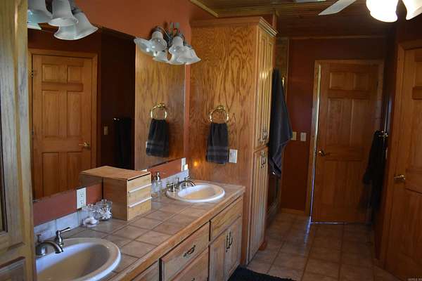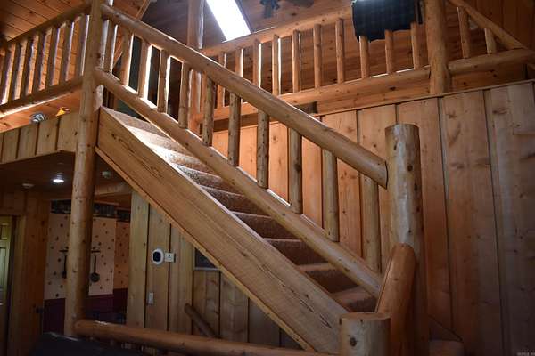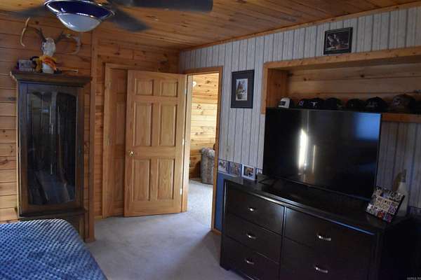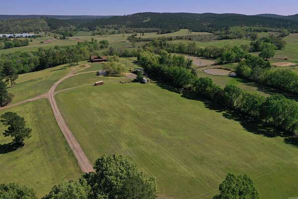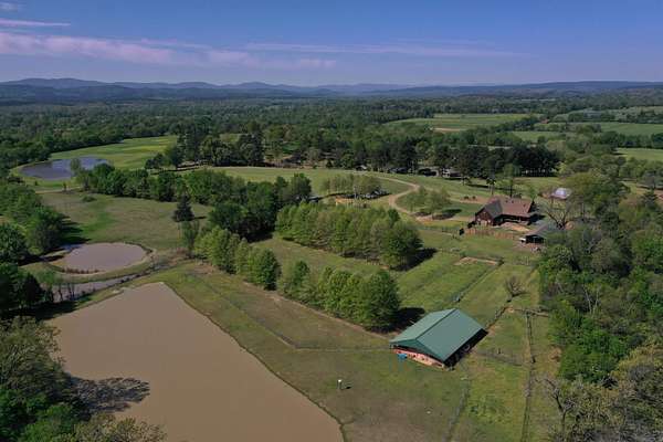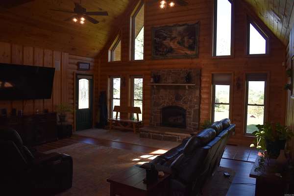 The mountain views in nearly every direction from the wrap around porch of this two-story home are nothing short of awe inspiring! This 4900 square foot log siding home is perched atop a small knoll near the back of the 15 +/- acres that surround it. The home not only boasts an amount of square footage that is hard to find, but a combination of rustic finishes and beautiful craftsmanship. As you walk up the stone walkway to the front of the home, you will notice the beautiful masonry around the wrap around porches, the perfect place to enjoy a cup of coffee as you watch the sunrise over the Ouachita Mountains. The main level of the home has a large living room with a vaulted ceiling and fireplace, and windows with views of the mountains. The spaciously designed floorplan has two bedrooms and two full baths on the main level of the home, accompanied by a large laundry room just off of the two-car carport. Upstairs, two suite style bedrooms are connected by a loft overlooking the living room. The full basement downstairs is the perfect quite space for a home gym, office, or separate living quarters. There is a half bath, as well as a walkout door to the rear of the home.
