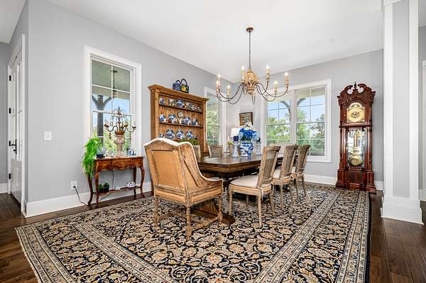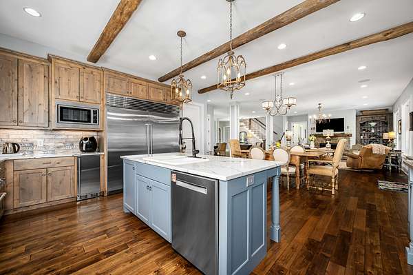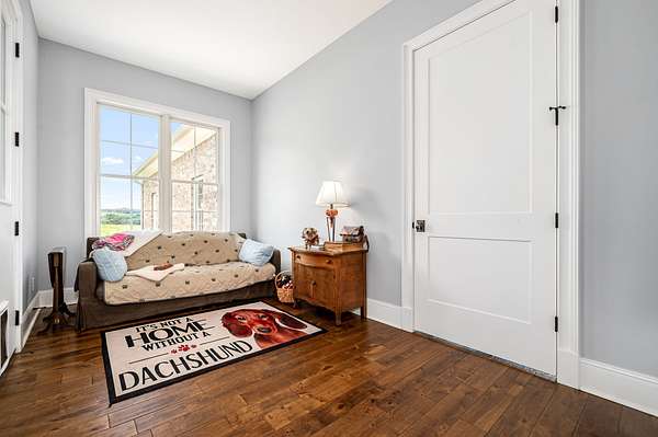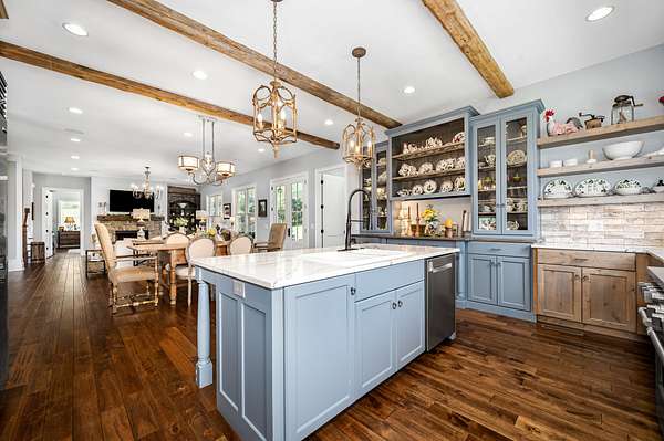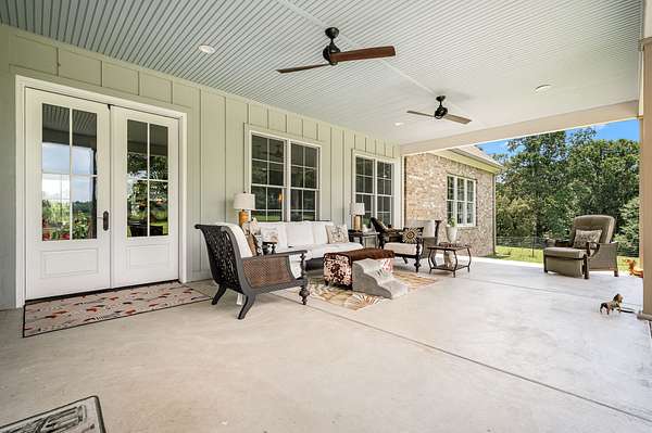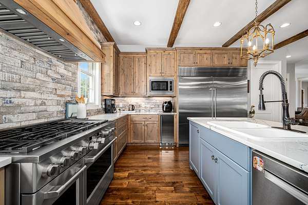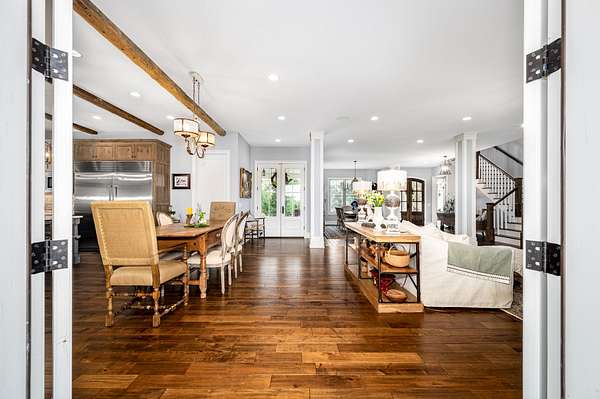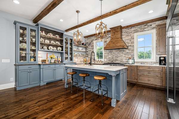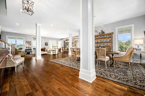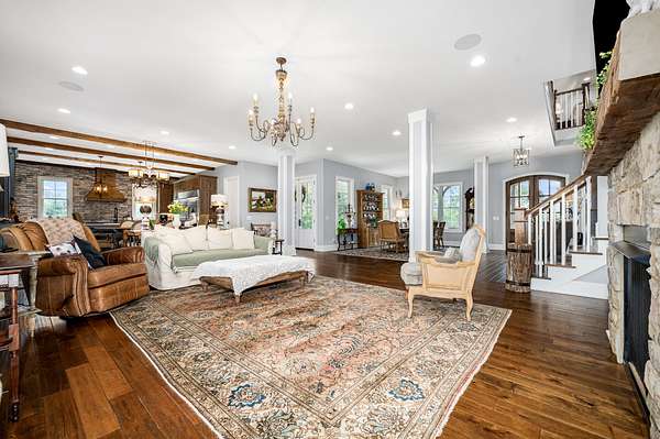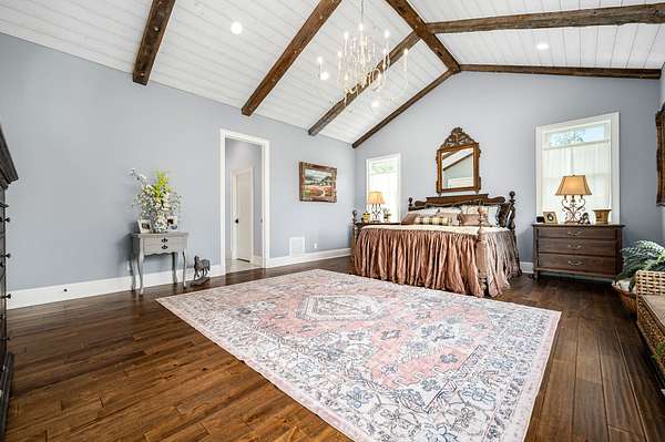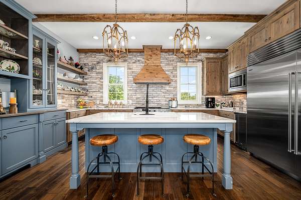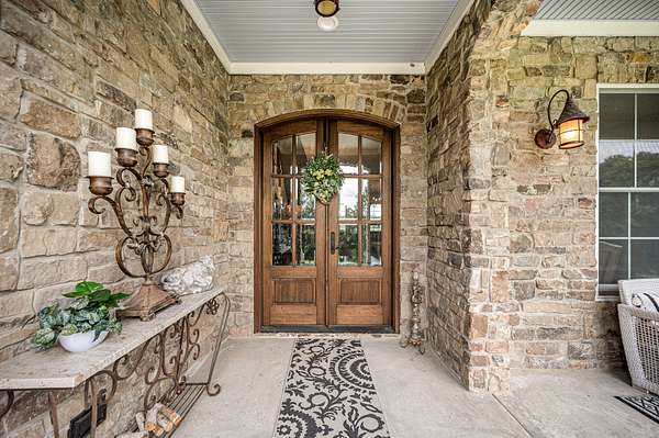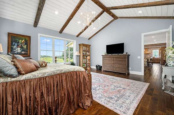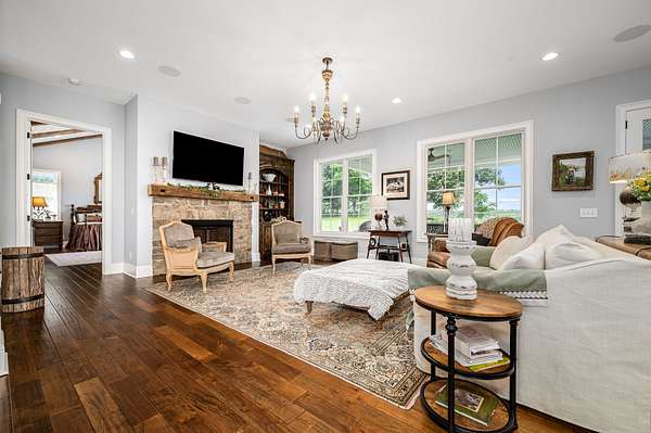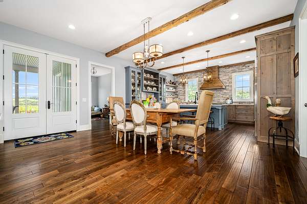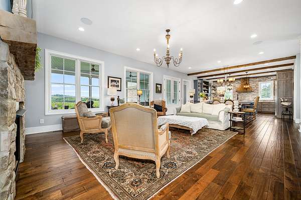 Welcome to your dream estate- an exquisite 4,900-square-foot stone and brick residence that marries French-country charm with today's most sought-after conveniences. Nestled on a 6+/acre lot with hillside views. This home's stone and brick facade and sweeping covered porches invites you inside to discover an impeccably designed interior, where every detail has been thoughtfully curated. Walking through the front door you encounter the open plan living and dining room with beautiful hardwood floors throughout the first floor, connected with the gourmet chef's kitchen with custom cabinetry, late 1700s reclaimed beams used throughout the first floor. The primary retreat features vaulted ceilings w/ beams, double walk-in closets and a spa-inspired bath. Upstairs you will find a relaxing den area with two large bedrooms each with full baths and walk-in closets. Truely Unmatched Craftmanship from the reclaimed timber ceiling beams to the custom millwork in the cabinetry and trim. Don't miss the opportunity to make this exceptional French-country manor your own! SEE Virtual Floor Plan Tour.