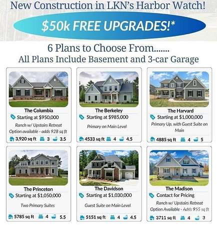 UP TO $60k BUYER INCENTIVE on NEW CONSTRUCTION in LKN's Harbor Watch! Beautiful 4 BR/4.5 BA home with Primary on main, & partially finished basement totals over 4500 sq ft, priced with $80k upgrade allowance. Get started now to make all desired selections & choose other upgrades! Kitchen features double wall oven & farmhouse island and opens to Casual Dining area & Family Room with modern fireplace & gorgeous surround options, opening to semi wrap around covered deck. Owner's suite features tray ceiling & huge walk-in closet, granite countertops & large walk-in shower & option for free-standing tub! Upstairs opens to huge loft, perfect for fun & leisure! Basement features large rec area, full bath, wet bar, & plenty of storage space, with other room options! Community includes lake access/launch area, day dock, boat storage, interior stocked ponds. 5 total plans & other homesites available! See photos for other plans!