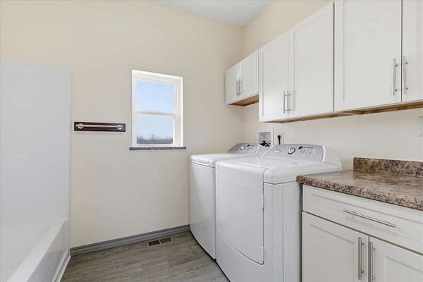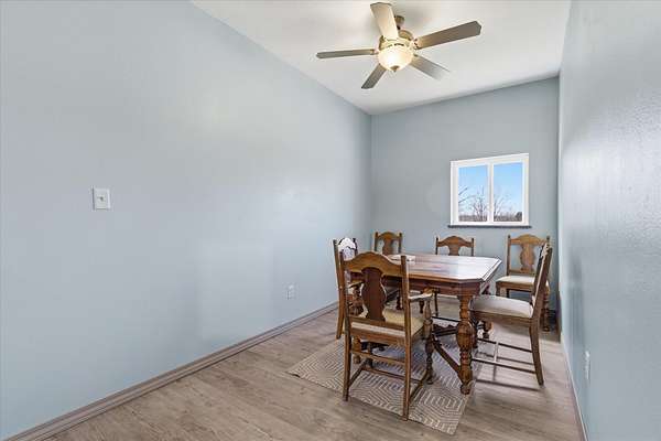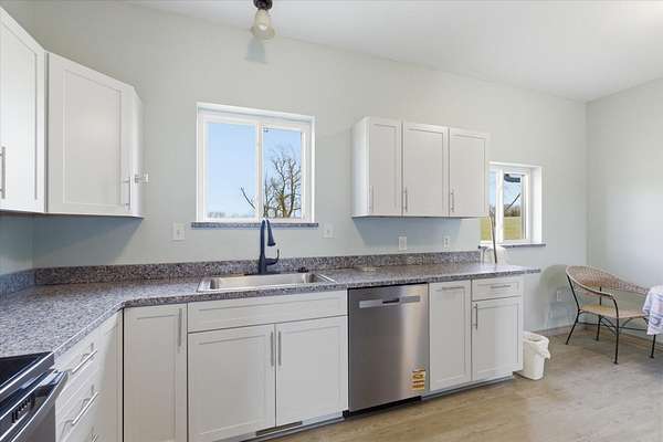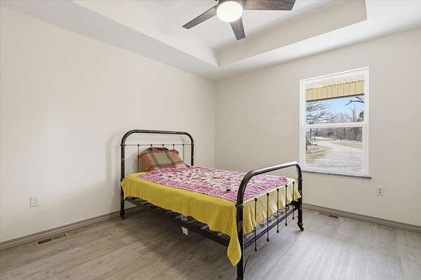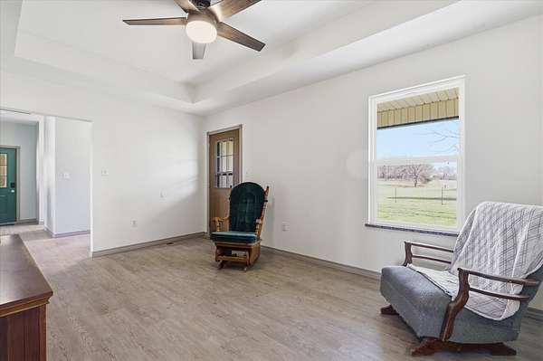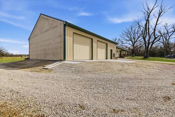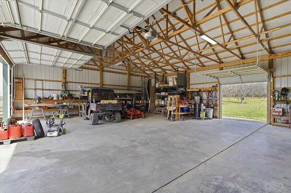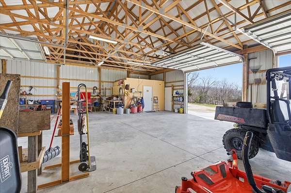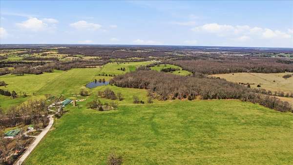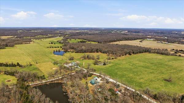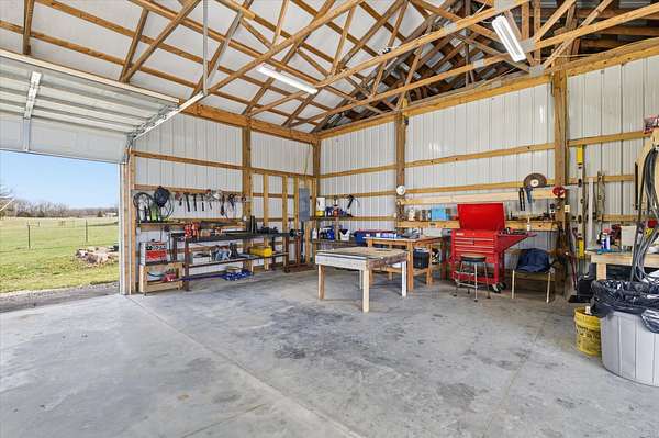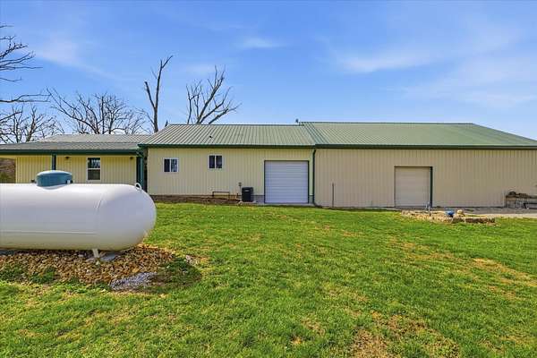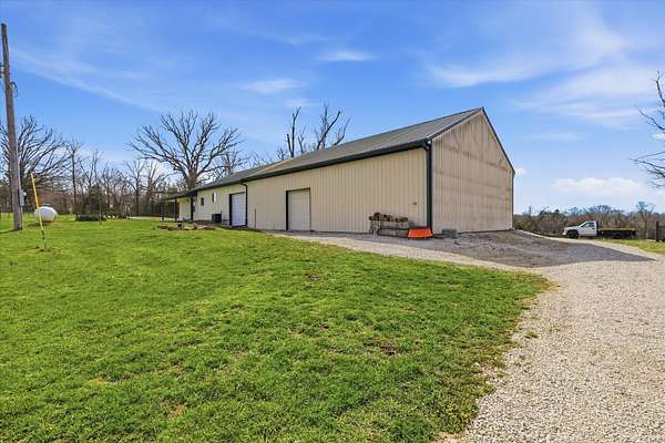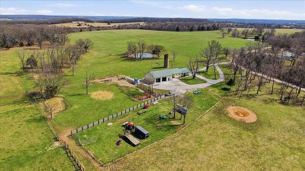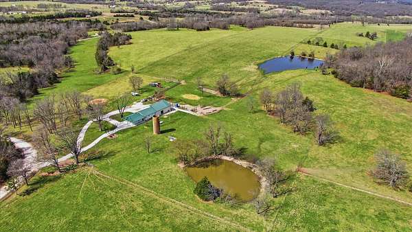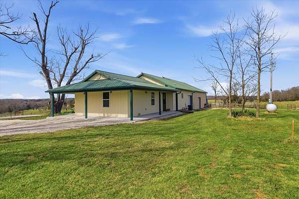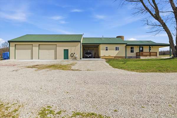 Tucked away on 110 breathtaking acres in Southern Dallas County, this newly built 2025 barndominium-style home offers the perfect blend of modern comfort and wide-open country living. A private circular gravel drive welcomes you in, where panoramic views stretch across the rolling landscape. Relax and take it all in from the covered wrap-around porch--ideal for quiet mornings or evening sunsets.Inside, the entry opens to a warm and inviting main living area accented by tray ceilings, creating an elevated yet cozy feel. The kitchen features light grey cabinetry, granite countertops, and a breakfast nook, along with a dedicated dining space perfect for hosting. Offering 2 spacious bedrooms and 2 full bathrooms, the layout is both functional and comfortable. The primary suite includes a large walk-in closet with built-in shelving, while the bathroom showcases a walk-in shower.The property truly shines outdoors with a finished 36x48 shop, complete with three garage bays, an office space, and a half bathroom--perfect for work or hobbies. A versatile carport offers pull-through access from the front or garage door entry at the rear.Designed with both recreation and agriculture in mind, this expansive property features corrals, working pens, a loading chute, an upright silo, mostly new fencing, and a spring-fed wet weather creek. You'll also find mature trees and multiple large ponds, creating a beautiful and functional setting ready for livestock, farming, or simply enjoying the land. Enjoy peaceful country living with the convenience of being just a short 30-minute drive to Springfield, and only minutes from the surrounding towns of Buffalo, Fair Grove, and Marshfield.