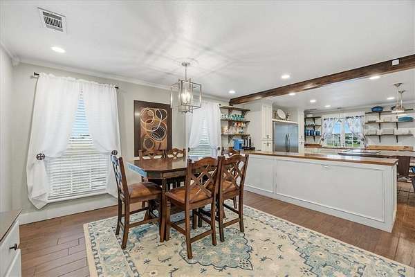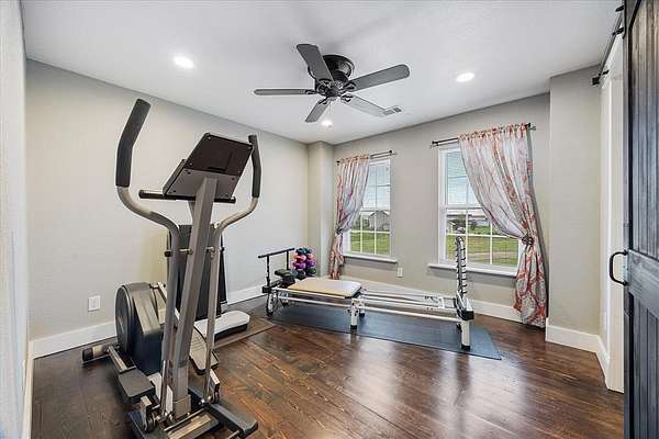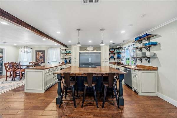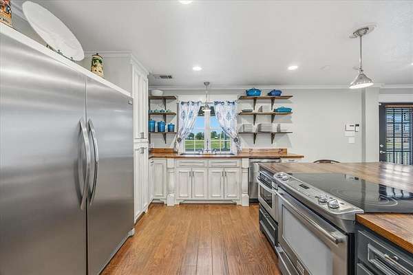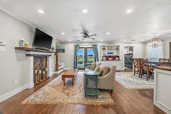 On 1.5 acres at the end of a private road, this property offers privacy, open views, & an entertainer-friendly open concept floor plan. Unique features include an office, laundry with Dutch door, water manifold system, outdoor shower, full RV hookup, generator electrical plug, whole home surge protector, large floored attic with LED lighting, dual HVAC systems with digital thermostats, storm shelter under stairs, 20x30 workshop on a concrete slab (currently being used as a single-car detached garage) wired with multiple electric outlets, a storage loft and plug-in overhead lights under the loft area. Property also has 8'x8' shed on skids for mobility.