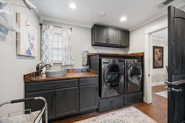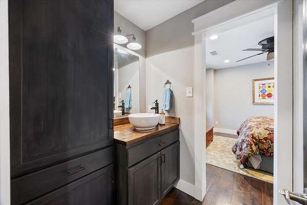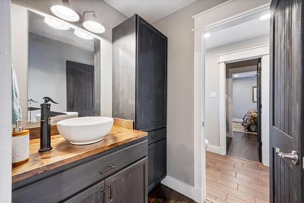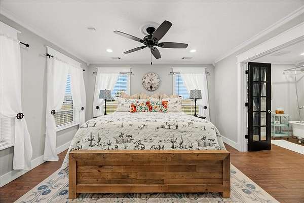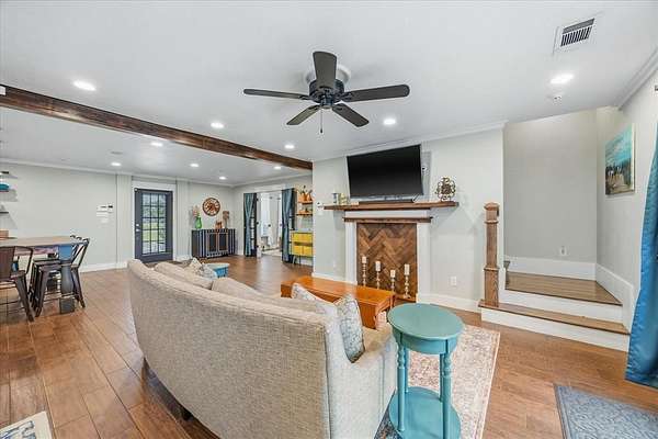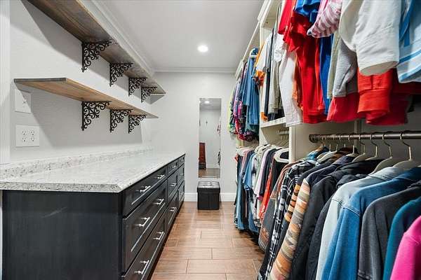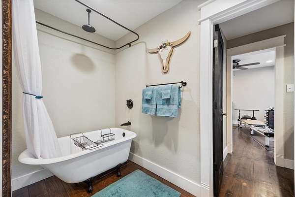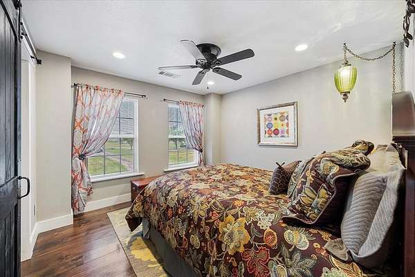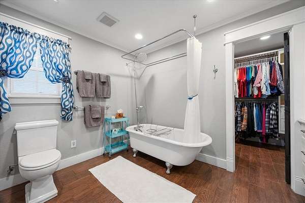 Additional interior features include a kitchen with large built-in island with seating space for 5 & long peninsula, perfect for entertaining. Recessed LED lighting throughout, huge walk-in primary closet with built-ins, built-in chest of drawers in both upstairs bedroom closets, porcelain wood aesthetic tile throughout the downstairs & in the upstairs bathroom, wood flooring upstairs, & clawfoot cast iron tubs. The upstairs bedrooms feature a Jack & Jill style bath with rain head shower & sliding barn doors for each bedroom closet.