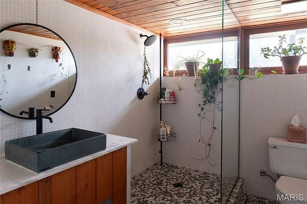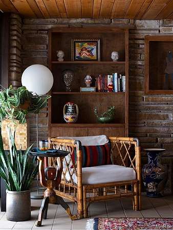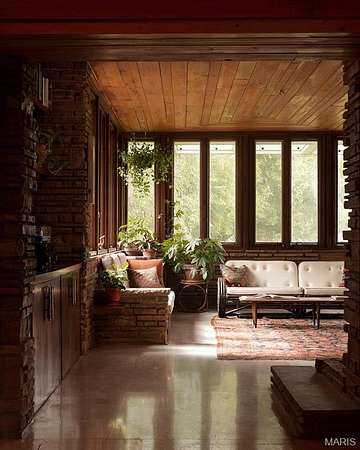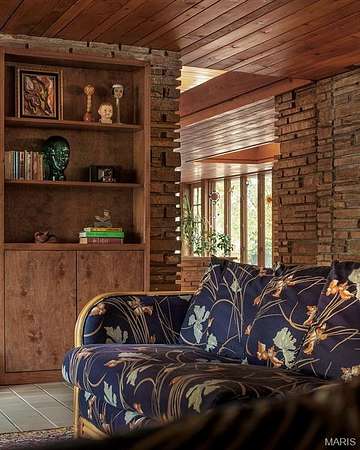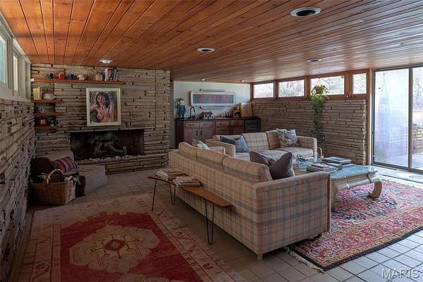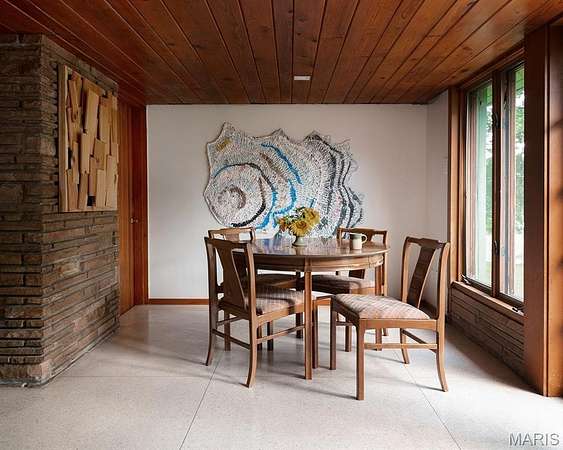 Spanning 4,500+ sq ft, the single-level home includes four bedrooms, three full bathrooms, two dining areas, two sitting rooms and a wet bar. Stone surfaces extend from exterior to interior, while terrazzo floors and wood carsiding ceilings run throughout the living areas. Large windows, some wall-spanning, others clerestory, flood the home with natural light and frame views of the wooded property. Bringing the outdoors in, the formal dining room features a 19ft long raised indoor garden.