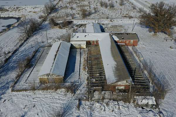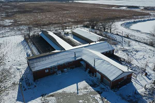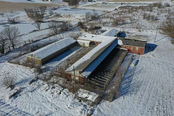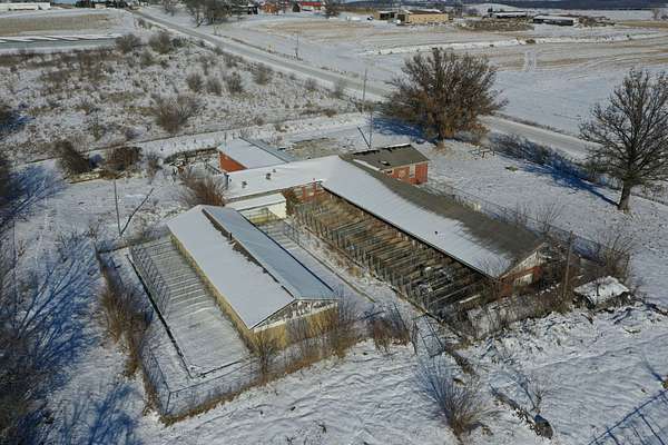 The property features two wings branching off the main structure, one equipped with 48 dog runs and the other with 38 dog runs. The runs are well-built with thick concrete flooring, floor drains, and indoor/outdoor access, providing functional infrastructure for animal-related operations. Previously used as a veterinary clinic, this site could continue in a similar use or be repurposed for a variety of commercial needs.