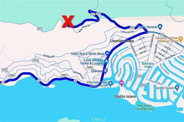 From Hwy 20, turn north on High Valley Rd. Turn left on Cerrito Dr. Pass Alta Vista Dr. The parcel is on the right. Take the aerial map. Boundaries in aerial map are only approximate.