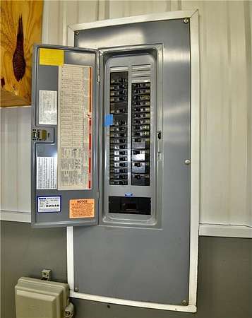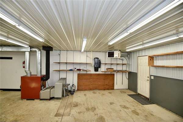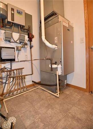 Energy-efficient home with multiple heat sources including a high-efficiency wood-burning furnace (located in garage) capable of heating the home and garage, forced air LP furnace with central A/C, and electric boiler system providing in-floor heat.