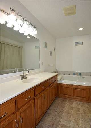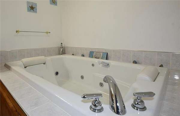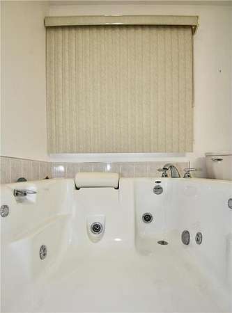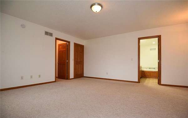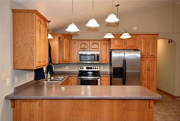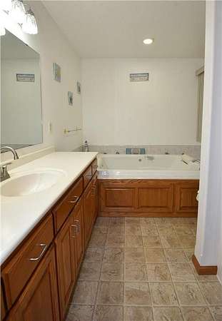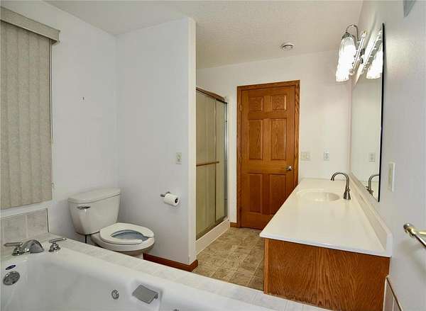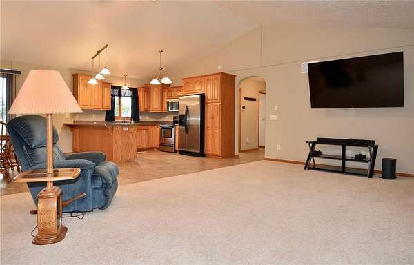 Open-concept vaulted living, dining, and kitchen area includes custom oak cabinetry, stainless steel appliances, and ample counter space. Owner’s suite offers a walk-in closet and private full bath with oversized whirlpool tub and separate corner shower.