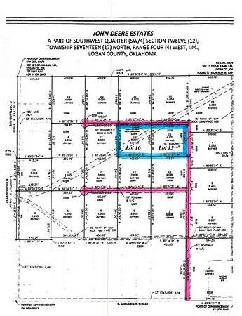 Lots 15 & 16 MUST BE Sold together - Rural/Acreage Subdivision in Logan County, on the north side of Crescent (Crescent Schools but not in City limits). Approx 1/4 section subdivision, bordered on the West side by Broadway (aka Portland or John Deere Rd) & on the South side by Sanderson Rd (or Hwy 74C). Interior lots of subdivision have all weather gravel streets. Sanderson Terr Runs north off Hwy 74C, and the 2 west-bound cul-de-sac streets are Tractor Way (comes 1st) and Aldridge Ct (further north) Animals & shops are welcome, but no businesses or mobile homes. Not permissible to live in a temporary structure or outbuilding while building your home Minimum sq. ft. for homes is 1800 sf, and must be 70% brick, stone or masonry. You will need well & septic. Pioneer has fiber optics for phone & internet, OG&E supplies electric for the addition - if you want gas service it will be propane. See Covenants & Restrictions & Plat Drawing in Supplements. See Plat also in photos. Combined acreage for Lots 15 & 16 is Approx. 7.65 ACMOL with approximately 392 ft frontage on Sanderson Terrace & approximately 852 ft on Aldridge Ct This is a great neighborhood with mostly 3.6 and 5+ acre parcels - several nice-sized custom homes are complete and occupied with a couple more in the construction phase. Come Build your forever home in John Deere Estates!