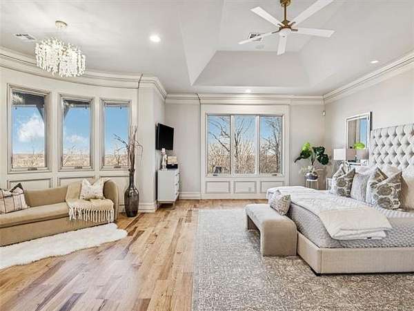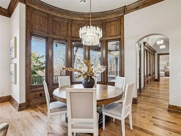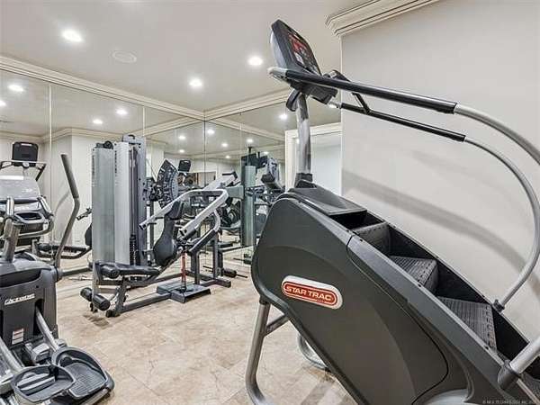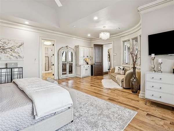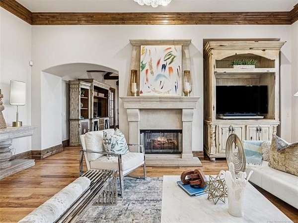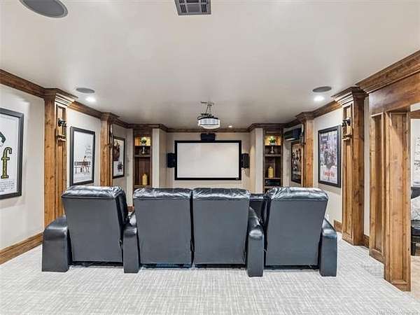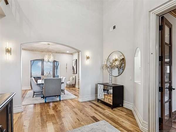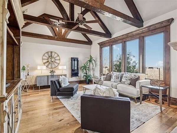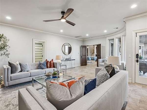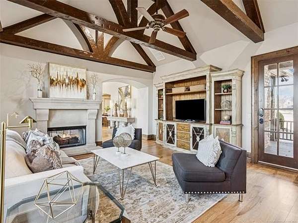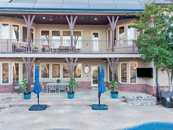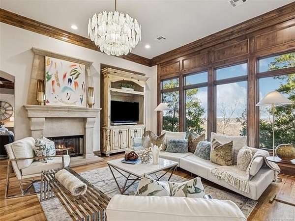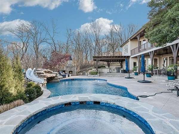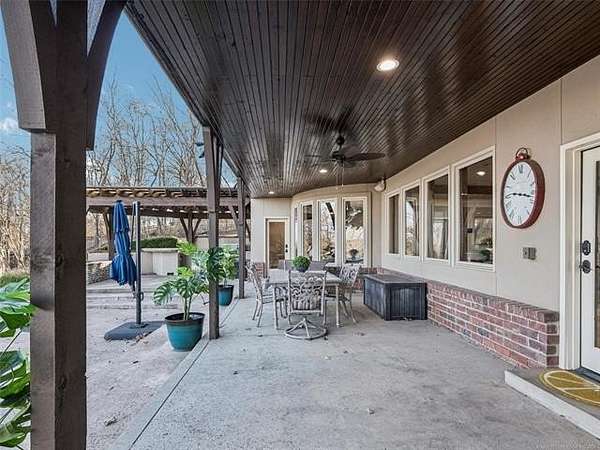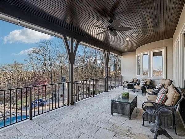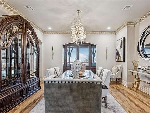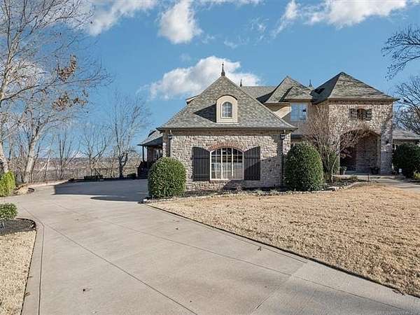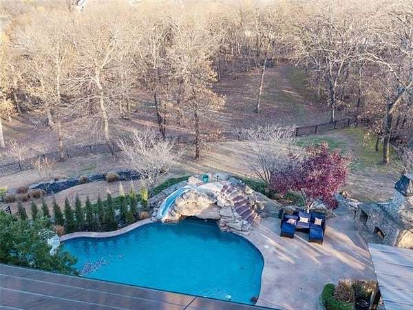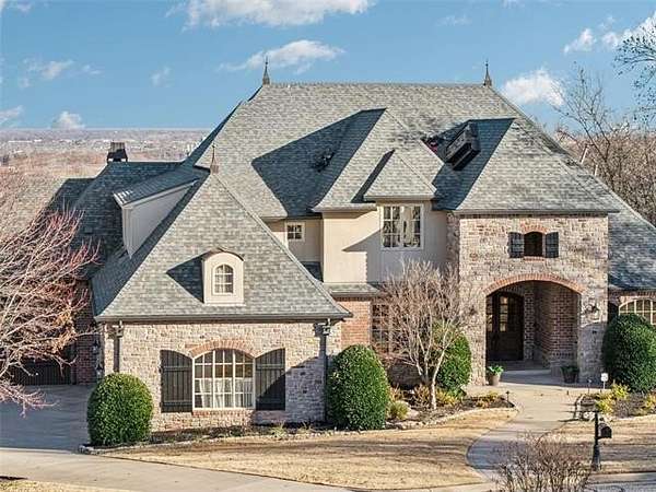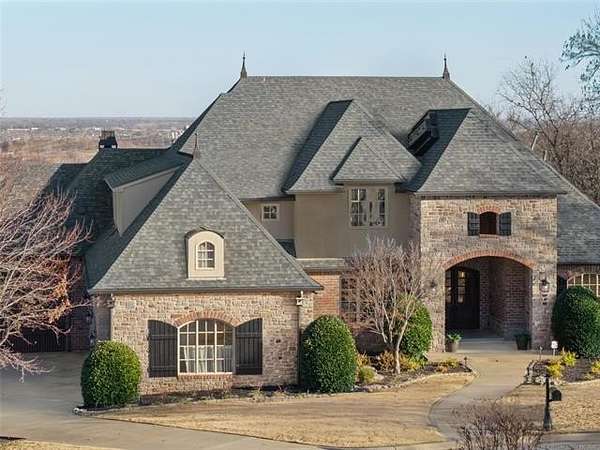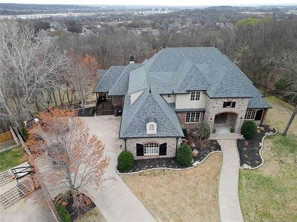 This one-of-a-kind enclave in Jenks is an estate resting on a cul-de-sac across nearly 2 acres w/ sweeping views stretching to the river. Thoughtfully built & meticulously renovated over past year, this home offers refined luxury across 3 expansive levels. Main level (2nd flr) showcases an elegant formal dining room with panoramic views; 2 private bedroom suites, a dedicated office, a chef's kitchen & 2 living areas. Primary suite is a sanctuary w/ serene vistas, FP, soaking tub, separate walk-in shower & lg walk-in closet. A 2nd bdrm offers its own private bath & walk-in closet; a wet bar/butler's pantry seamlessly connects formal & casual entertaining spaces. The kitchen has high-end appliances including an 8-burner range, double ovens, oversized island, abundant cabinetry & walk-in pantry + convenient access to the 4-car garage, side patio/drive, laundry room & half bath. Living spaces are anchored by a cast cement fireplace & walls of windows creating the feel of a luxury treehouse, immersed in views. The 3rd flr offers a loft-style seating area, built-in study nook, 3 lg bedrooms & 2 full baths- 1 bedroom ideal as a game room w/ dual walk-in closets. The lower level is designed for entertainment, featuring a wet bar or second kitchen, fully equipped theater room, game room, home gym & a spacious pool room that c/b a 6th bedroom. Outdoors, the property transforms into a private resort w/ a pool, hot tub & slide + a stone FP, pergola & outdoor kitchen. Renovations include: paint throughout, high-end carpet & padding, refinished & extended hardwoods, luxury lighting & fans, quartz countertops, upgraded fixtures, soft-close cabinetry, enhanced garage systems, new exterior lighting, a rainproof pergola, improved drainage, refreshed exterior finishes & a like-new pool: updated tile, stone coping, LED lighting, plaster & mechanicals. This is a rare opportunity to own a luxurious retreat designed for elevated living, unforgettable entertaining & lasting enjoyment.