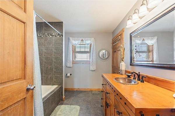 - A walk-through full bath with a unique copper sink and a jacuzzi tub with tile surround.