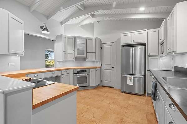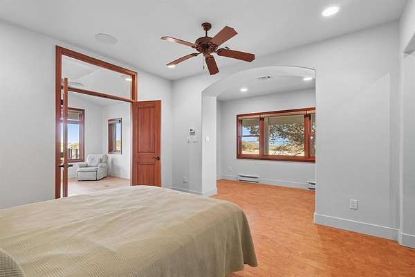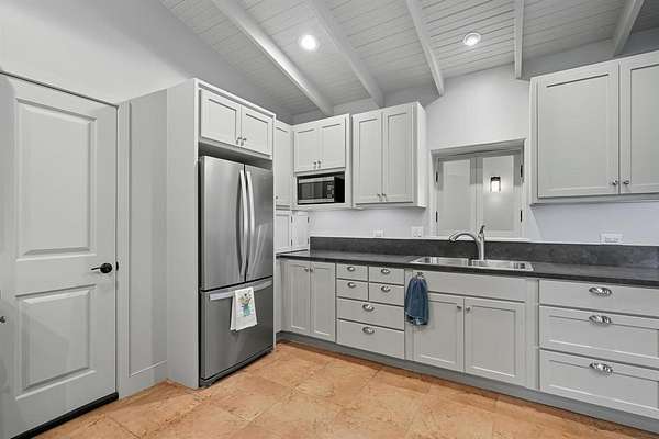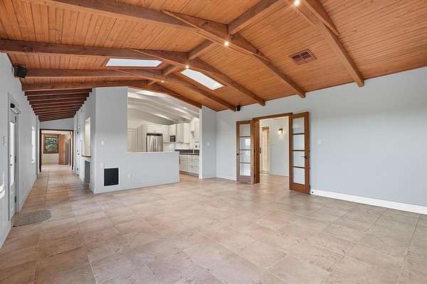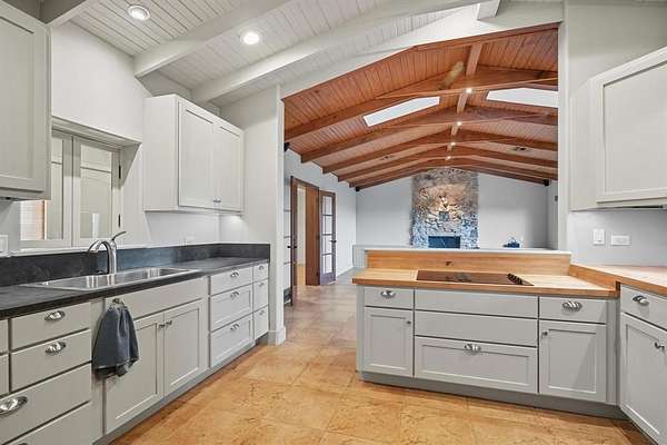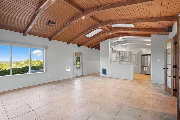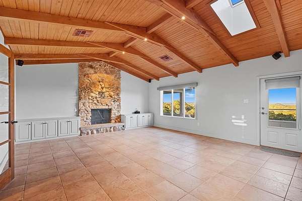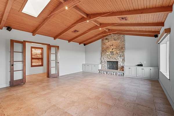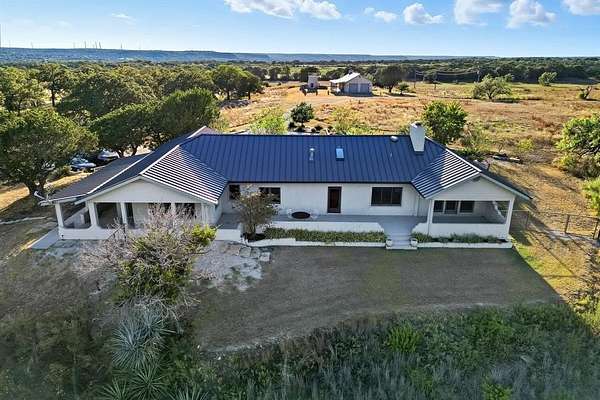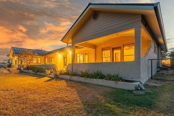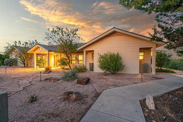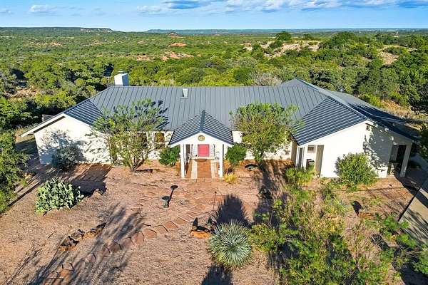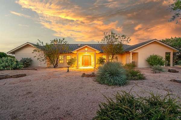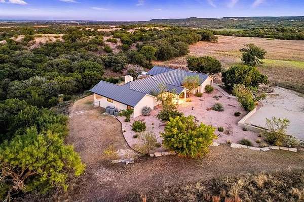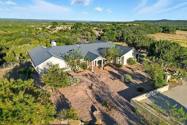 This one-of-a-kind property combines Southwest charm with modern amenities, set against a backdrop of breathtaking natural beauty. A half-mile drive from the county road leads to an elevated perch, revealing a Southwest-style stucco home surrounded by expansive vistas. A flagstone walkway welcomes you to the front door and into a light-filled gallery. Double doors open to a spacious living room with a native stone fireplace and a picture window framing stunning views of the local mesas, canyons, and Buffalo Gap in the distance. The heart of the home is undoubtedly the kitchen with ample space for hosting and everyday living. Additional space is the home library. The master suite features a tiled shower, walk-in closet, heated bathroom flooring and an adjoining sitting room with access to a covered porch. Located on the opposite side of the house is the second bedroom and full bath complete with its own breathtaking views. A short distance from the home is a charming one-room space with a fireplace equipped with a three quarter bathroom and small kitchenette, attached to a garage, perfect for visitors or extra privacy. The original house was remodeled, new construction during 2011. The flooring is tile, stained concrete and cork. Other features include heat pump, windows by Anderson and Marvin, skylights, covered porches, metal roof, underground power, fiber optic internet, custom sound system, landscaping by Masterscapes- maintained by the engineered 20,000 gallon underground water catch system. The terrain is unique. Native grass pastures quickly turn to cliffs and distinctive rock formations. Fall color is vibrant with various species of oaks. In Spring open field grass is green, dotted with wild flowers. A former cistern converted into a stone tower offers a birds eye view, perfect for stargazing or soaking in the landscape. Enjoy spectacular sunrises and moonrises over Buffalo Gap from the living room, den, sitting areas, and multiple porches.