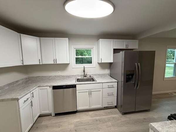 Enjoy a country feel with the convenience of shopping and highways just minutes away. This home has been fully remodeled inside and out. Recent improvements include a new garage roof, garage door and opener, updated vinyl siding on the house and garage, and new gutters on house, new windows on house, insulation, drywall, trim, paint, laminate and carpet flooring. You'll love the brand-new kitchen with stainless steel appliances. The bathroom has been completely updated along with new PEX plumbing, electrical panel, furnace, water heater, and light fixtures. The basement has been freshly painted and the home includes a convenient main level laundry room. Situated on a large lot with easy access to the highway, this property provides open space and privacy with no neighboring homes directly on either side.