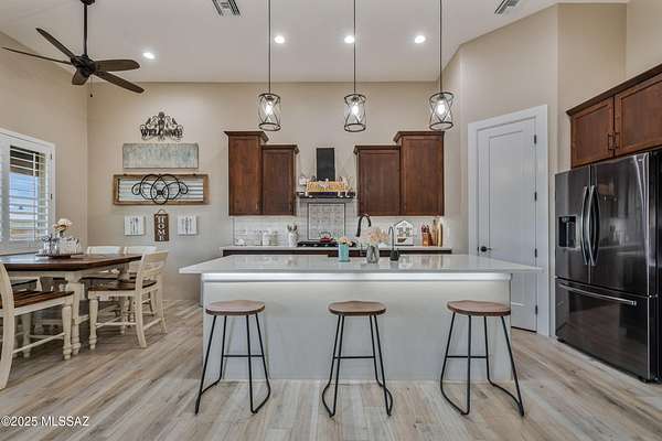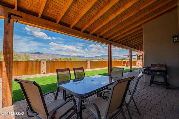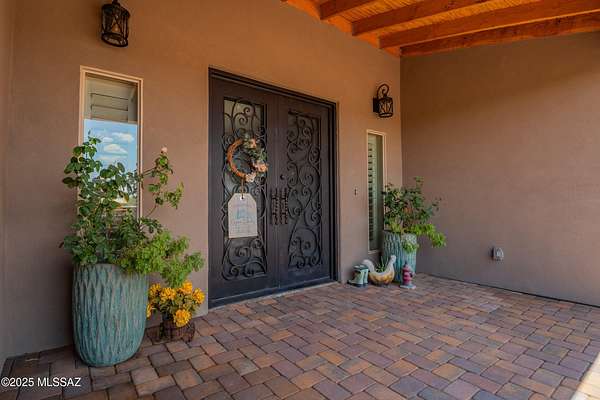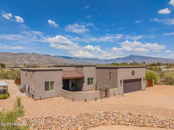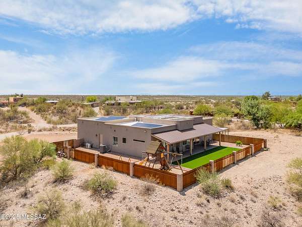 Stunning 2023 custom 3 bed, 2 bath + den home on nearly 5 acres with breathtaking views of Rincon Valley and Saguaro National Monument East. A welcoming courtyard entry leads into a bright, open split-bedroom floorplan with high ceilings and designer finishes throughout. Oversized, air-conditioned 2-car garage is perfect for projects or storage. No HOA--bring your RVs, trailers, horses, and toys! Enjoy a landscaped yard with artificial turf, kids' play area, and a full-length covered patio. Enjoy the peace of a beautiful rural setting where you feel worlds away from the hustle and bustle--yet you're just minutes from the conveniences of town and great schools. The perfect blend of privacy and accessibility. Endless potential to expand on this private Rocking K property.
