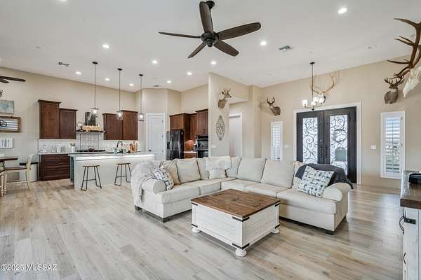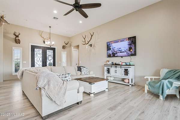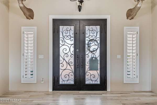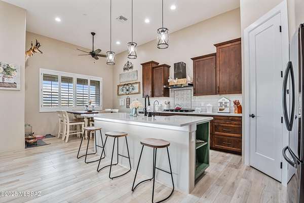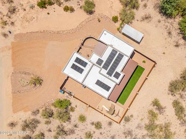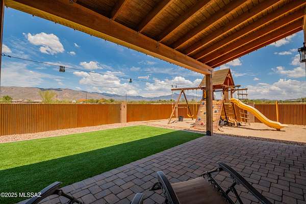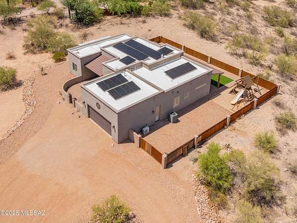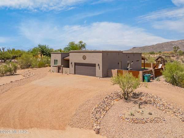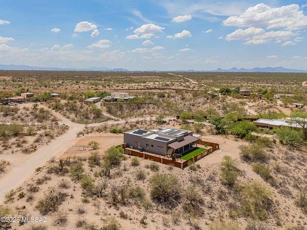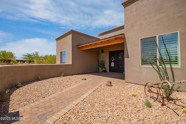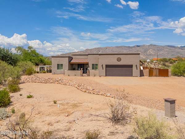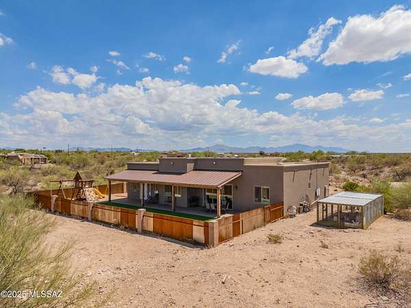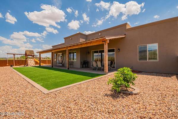 Stunning 2023 custom 3 bed, 2 bath + den home on nearly 5 acres with breathtaking views of Rincon Valley and Saguaro National Monument East. A welcoming courtyard entry leads into a bright, open split-bedroom floorplan with high ceilings and designer finishes throughout. Oversized, air-conditioned 2-car garage is perfect for projects or storage. No HOA-bring your RVs, trailers, horses, and toys! Enjoy a landscaped yard with artificial turf, kids' play area, and a full-length covered patio. Enjoy the peace of a beautiful rural setting where you feel worlds away from the hustle and bustle-yet you're just minutes from the conveniences of town and great schools. The perfect blend of privacy and accessibility. Endless potential to expand on this private Rocking K property.