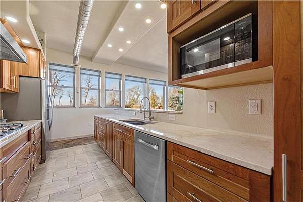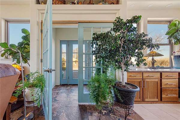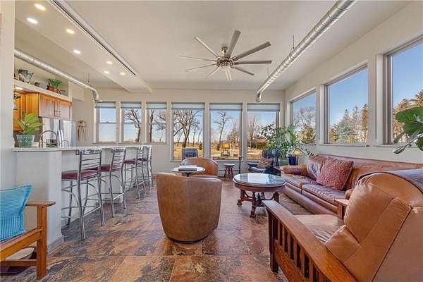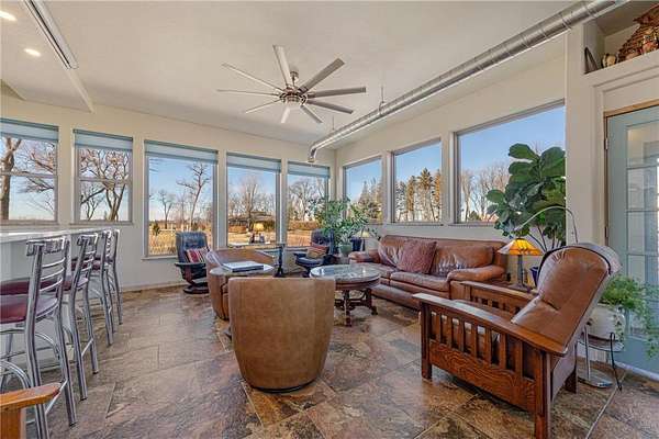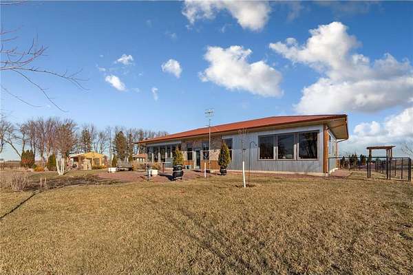 Single-level, ADA-friendly patio home on acreage with privacy, views, and modern finishes--ideal for out-of-state buyers seeking acountry retreat with accessibility and low-maintenance living. Enjoy thoughtfully designed 3-bedroom, 4-bath, true single-story living on approximately 4.47 acres, with no steps or stairways, extra-wide hallways and doorways, raised outlets, lever handles, and no neighbor within about a half mile, offering exceptional privacy plus sweeping sunrise and sunset views over open countryside. An open-concept floor plan connects the kitchen, dining, and living areas, where oversized windows in nearly every room, top-down/bottom-up blinds, and granite windowsills frame horizon views and fill the home withnatural light--perfect for nature lovers and remote workers seeking a peaceful setting. The chef's kitchen is built for everyday living and entertaining, featuring quartzite granite countertops, peninsula seating for four, custom cherry cabinets with maple doors, stainless steel GE 5-burner cooktop, Bosch dishwasher, KitchenAid double convection wall ovens, semi-pro vent hood, and a walk-in butler's pantry with second oversized refrigerator, prep sink,cabinet built-ins, and RO water with remineralization serving both the kitchen drinking faucet and the steam shower. In-floor radiant heat throughout thehome and attached garage, hard-surface porcelain tile and stained concrete flooring, bullnosed corners, and energy-conscious design support comfortable,low-maintenance living--highly desirable for retirees and snowbirds looking for a lock-and-leave style property. Each bedroom has its own private en-suitebathroom with blocking for future grab bars, making this an excellent option for aging in place or buyers needing accessible features. The primary suiteadds a custom tiled steam shower with built-in seating and a jetted soaking tub, creating a spa-like primary bathroom that appeals to wellness-focused and luxury-minded buyers. Additional spaces include a cozy den/reading room with door to a side patio, a well-appointed laundry room with granite-topped cabinetry and raised front-load washer and dryer, and an attached heated garage with stained concrete floor and dedicated storm-shelter-ideal for Midwestern weather peace of mind. The garage is completely finished complete with even granite window sills and transitions to the interior space effortlessly. Outside, this country property offers a detached powered workshop with wood-burning stove, a greenhouse for gardening enthusiasts, a pool area with quality filtration and heating equipment, patios, and landscaped yard--great for outdoor living, homesteading, hobbies, and enjoying nature and wildlife. Despite the private rural setting, the home remains conveniently located: approximately a 20-minute drive to Worthington for hospital/medical care, groceries, and everyday shopping, about an hour to Sioux Falls, around an hour to an hour and a half to the Okoboji Lakes recreation area, and roughly 2.5 to 3 hours to the southern Minneapolis-St. Paul metro--an attractive relocation opportunity for out-of-town and out-of-state buyers seeking an accessible, one-level patio home on acreage with big-sky views and easy access to major cities and airports.