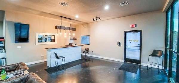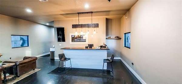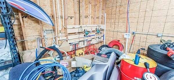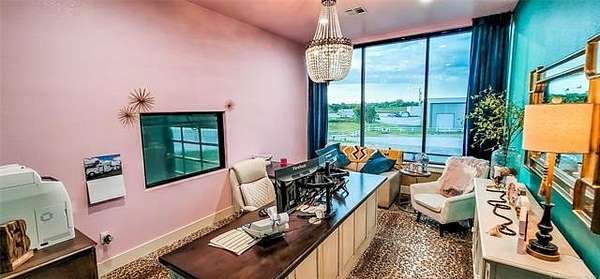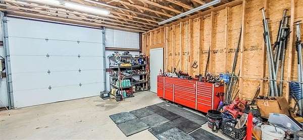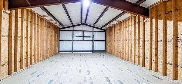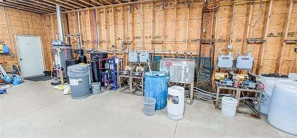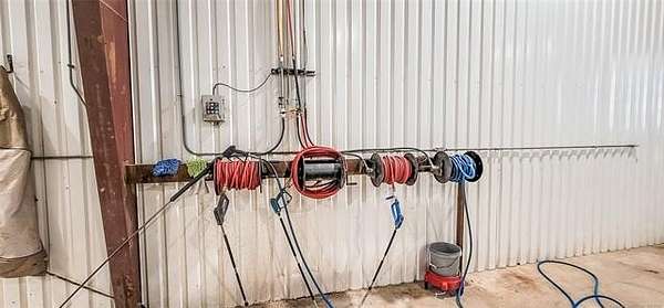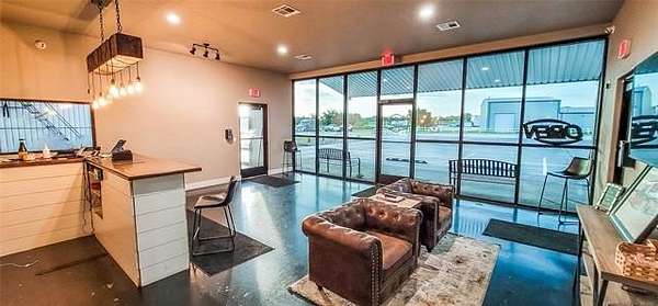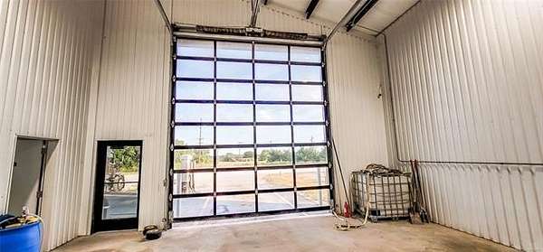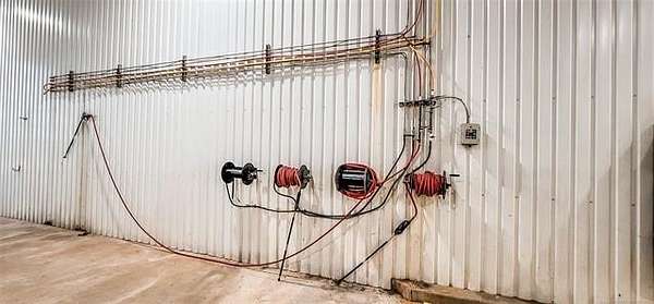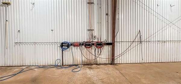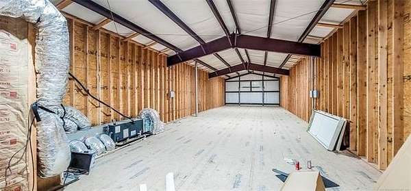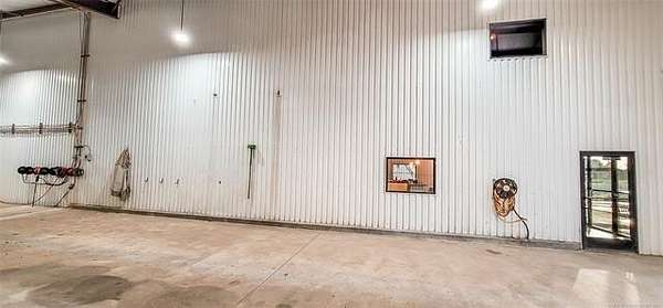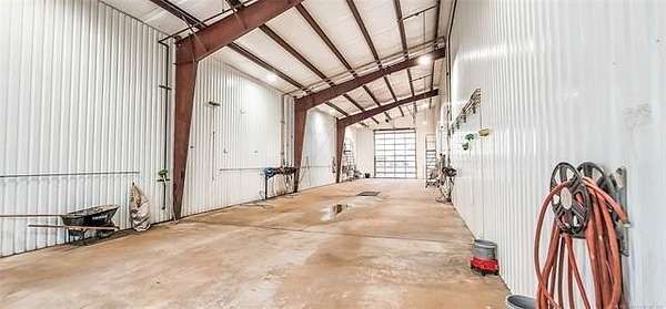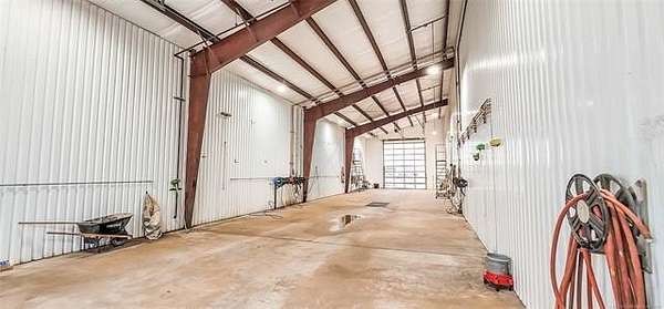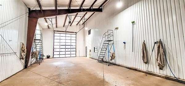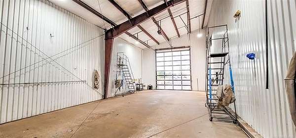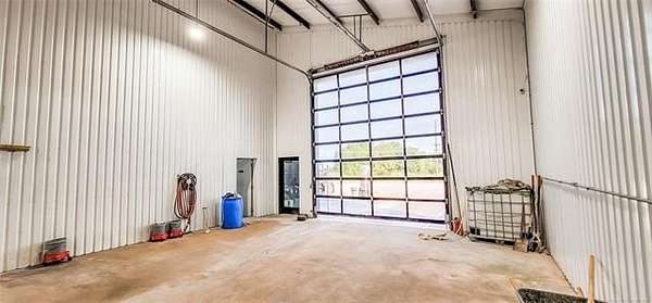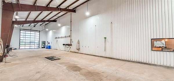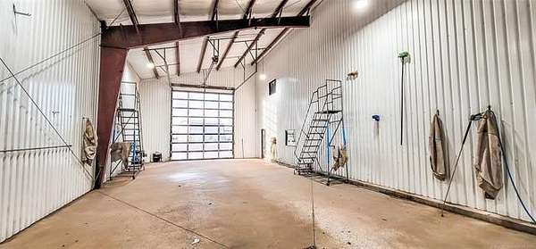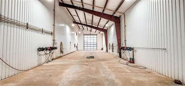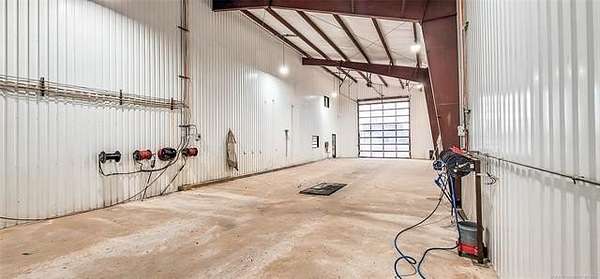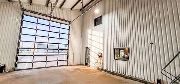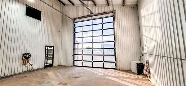 The 10,000+ square foot steel structure building with 20-foot eave heights and four 14'x16' glass bay doors, a 10'x10' overhead door, and heated wash bay floors.The main floor includes a 24'x50' drywall area with two restrooms and a shower, as well as a kitchen and breakroom.
