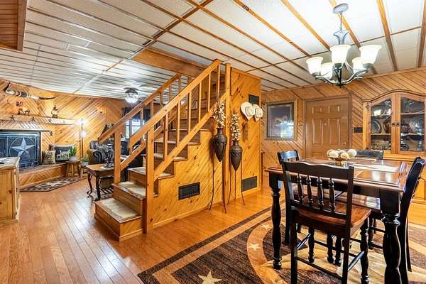 - Built-In Features, Cathedral Ceiling(s), Chandelier, Decorative Lighting, Eat-In Kitchen, High Speed Internet Available, Multiple Staircases, Natural Woodwork, Paneling, Sound System Wiring