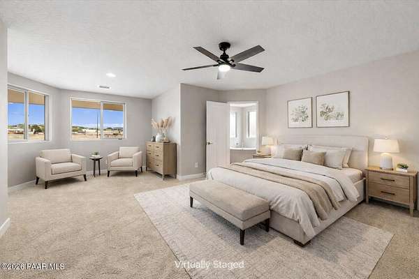 Brand New Home with Fantastic Views! 3 bed, 2 bath split floor plan home, nestled on a fully usable 2-acre parcel. Bring for your Horses, critters, toys, and more! Enjoy panoramic views from the oversized back patio, ideal for relaxing or entertaining. Inside, you'll find a spacious kitchen with a large island, ample sized pantry and plenty of quartz counterspace and cabinets. Open living room complete with beautiful gas fireplace. The primary suite offers a true retreat, with a sitting room, standalone tub, walk in shower, double vanity, and a huge walk-in closet. Large guest rooms and bathroom. Oversized 3-car attached garage. No HOA - Excellent well. Fully Fenced and gated 2.4 acres. Just 0.5 miles from pavement with an easy commute to town