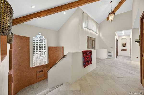 Inside, the home features expansive living spaces filled with natural light, soaring ceilings, and distinctive architectural details throughout. Arched openings, handcrafted finishes, exposed wooden beams, and multiple fireplaces create warmth and character, while large windows frame the surrounding foothills and city views. The layout flows seamlessly between living, dining, and entertaining spaces, offering both comfort and flexibility.