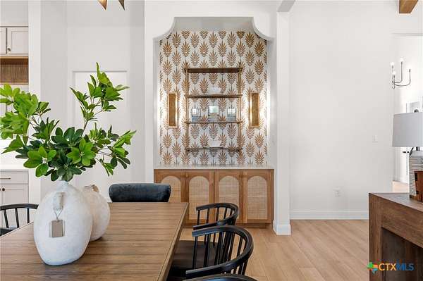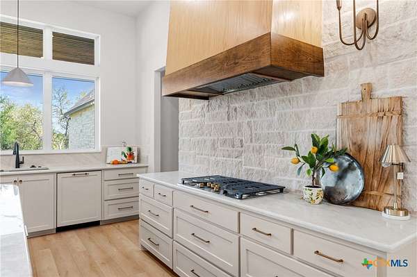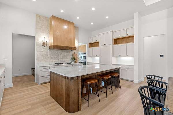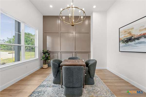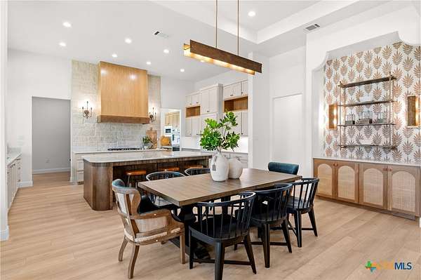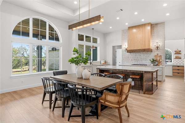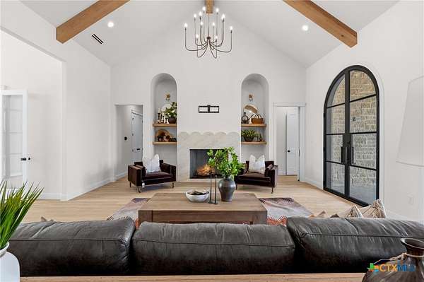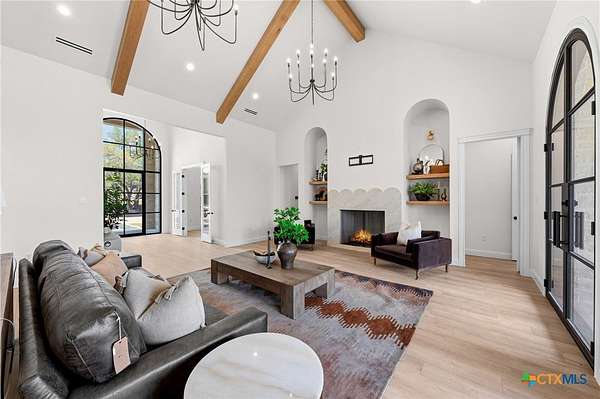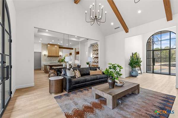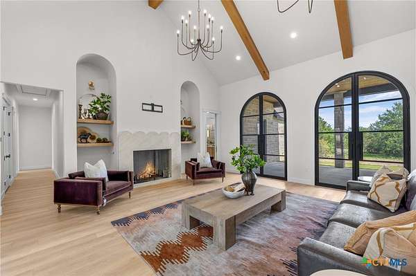 From the moment you arrive, this stunning home welcomes you with warmth, elegance, and thoughtful design. A grand entry featuring a striking black metal arched door sets the tone for the craftsmanship and detail found throughout. Step inside to discover a beautifully designed office complete with a custom accent wall and a hidden closet feature-perfectly blending style and function. The expansive living room impresses with vaulted, beamed ceilings and an oversized wood-burning fireplace, creating a cozy yet sophisticated gathering space. The open-concept dining area flows seamlessly into a chef's kitchen that is both bold and refined. Highlights include a dramatic rock accent wall, an oversized white oak island topped with exquisite Taj Mahal quartzite, and a stunning butler's pantry that is as practical as it is beautiful. The primary suite offers a private retreat you may never want to leave. Its spa-inspired bathroom features a large walk-in shower, freestanding soaking tub, rock accent wall, dual white oak vanities, and a spacious walk-in closet designed for ultimate comfort and luxury. Three additional guest bedrooms each offer their own dedicated bathrooms, providing both comfort and privacy. Step out on your oversized back porch and get ready to feel the stress melt away! Set on over 10 acres, this exceptional property is surrounded by mature trees, offering unmatched privacy, serenity, and space to enjoy the outdoors. Truly a must see, schedule your tour today!