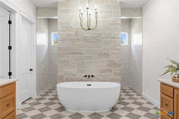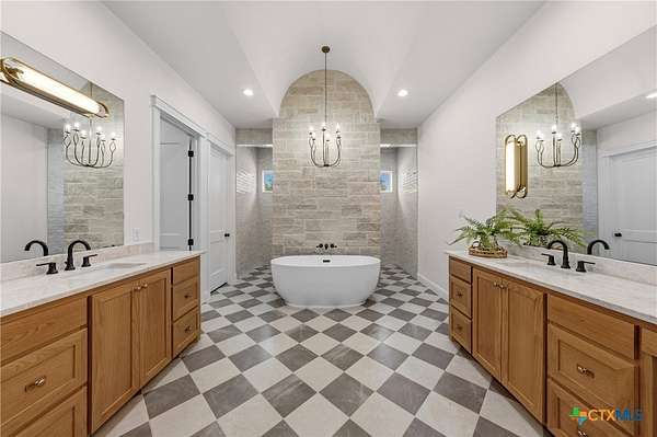 - All Bedrooms Down, Beamed Ceilings, Breakfast Bar, Built In Features, Ceiling Fans, Custom Cabinets, Double Vanity, Eat In Kitchen, Garden Tub Roman Tub, High Ceilings, Home Office, Kitchen Family Room Combo, Kitchen Island, Living Dining Room, Permanent Attic Stairs, Separate Shower, Split Bedrooms, Vanity, Vaulted Ceilings, Walk In Closets