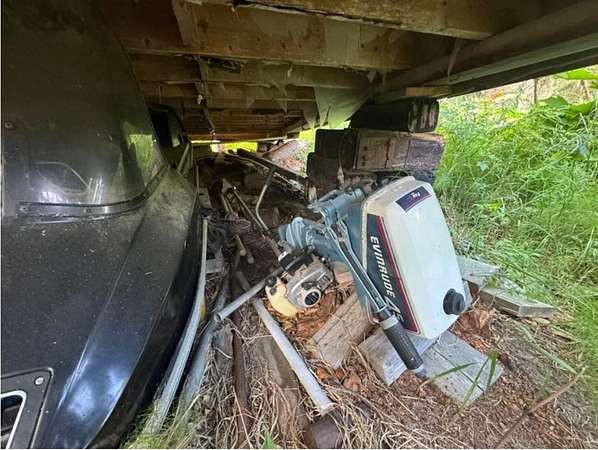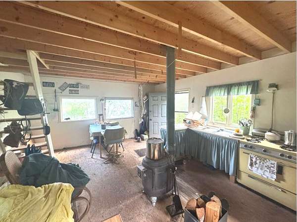 Has loft and fully insulated with a wood stove one v bottom boat a canoe with a couple outboard motors.