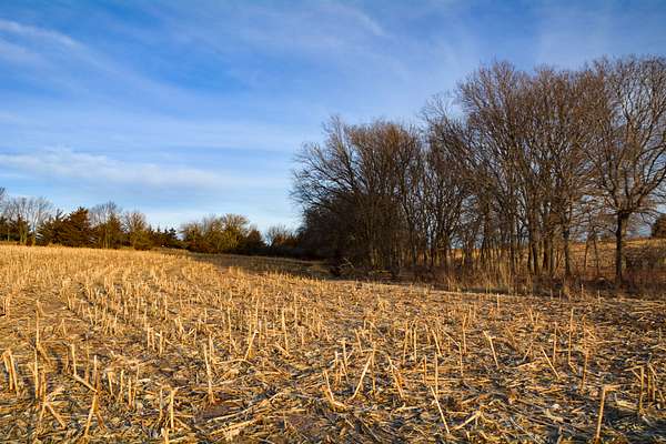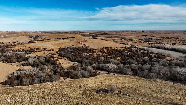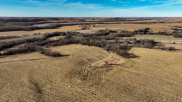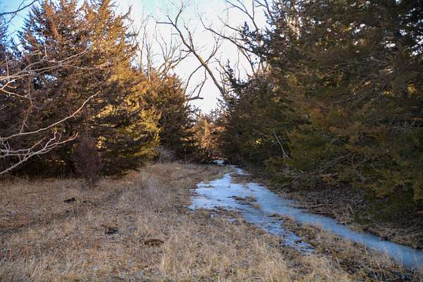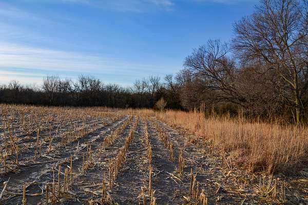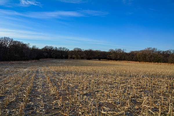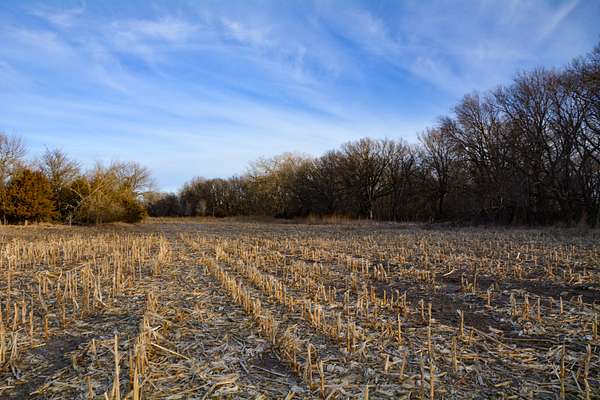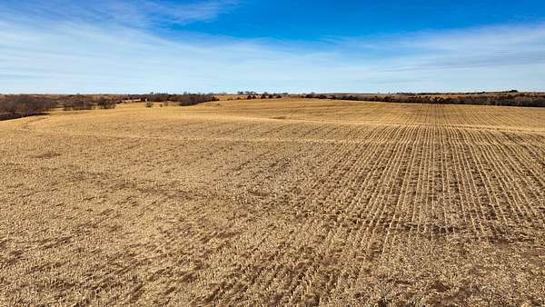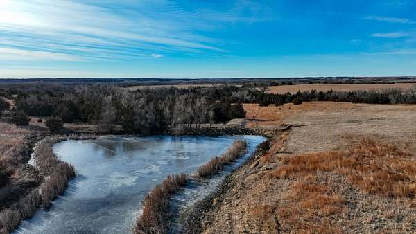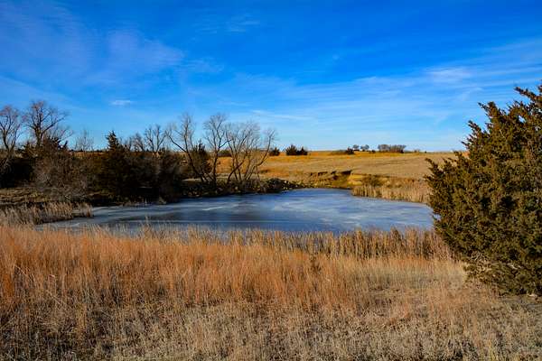 The tillable acres were planted to corn in 2025 and are currently open for the upcoming season, offering flexibility for future farming, food plots, or habitat enhancement. Just over a 1/2 acre pond is located in the north portion of the property, providing a reliable water source for wildlife and loafing area for the vast amounts of waterfowl that move through the area during the migratory season. Thick native grasses support strong upland bird populations, while mature trees throughout the draws offer excellent roosting habitat for turkeys.