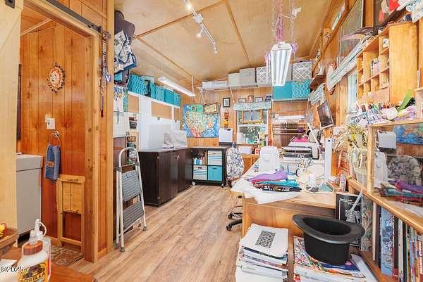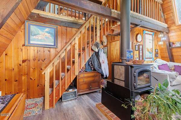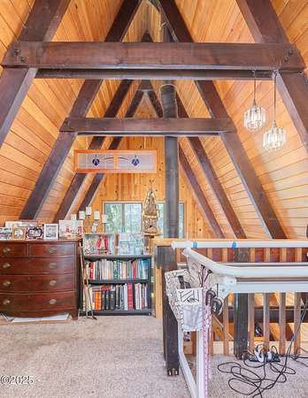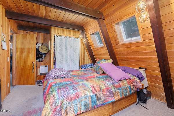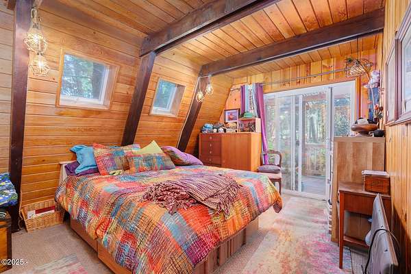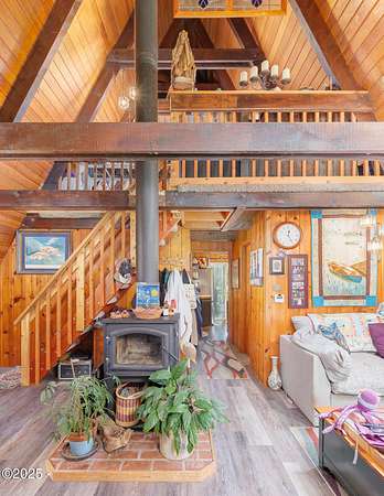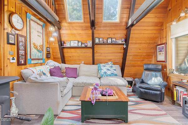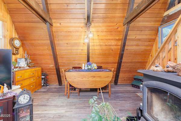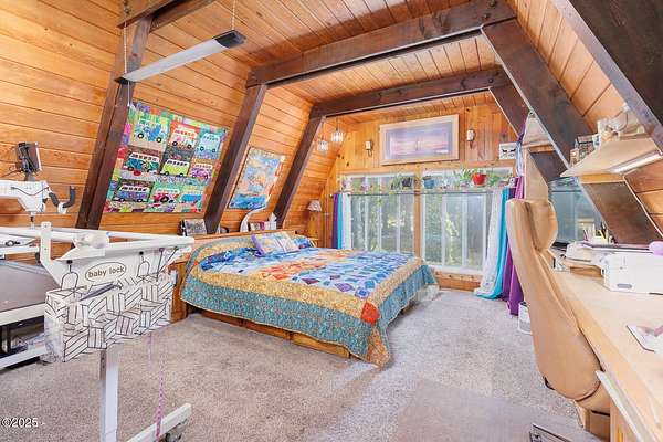 Step into the charm of this whimsical A-frame home, perfectly set on 5.74 enchanting acres. With 2 beds, 1.5 bath, and filtered views of Eckman Lake, this property blends rustic warmth with magical surroundings. Inside, the cozy design features soaring ceilings, exposed beams, skylights, and rich wood paneling. On stormy nights, the wood stove creates the perfect gathering place. The upstairs loft bedroom feels like a private treehouse complete with built-in storage and peaceful views. Enjoy covered porches on both the front and back of the home-perfect for sipping coffee, listening to the rain, or watching wildlife wander by. Outside, you'll discover a detached she-shed with a half bath, laundry room, and potential for an outdoor shower, plus a murphy bed making this a perfect spot for guests! You will also find a he-shed for all of your projects & passions! A wood-fired pizza oven invites evenings of outdoor entertaining, and the property also features tool sheds, a greenhouse, a detached carport, fruit trees (apple, plum, peach & cherry) and a fenced garden ready for your harvest. The large pasture has been used as a golf course and R/C trackperfect for recreation or creative new uses. Best of all, you have your own private access to Eckman Lake, where fishing, kayaking, and the beauty of nature await. Whether you're curling up with a novel, gardening, or paddling out on the water, this property offers an irresistible mix of charm, function, and adventure. Truly one-of-a-kind. This property offers a sense of peace and seclusion, a rare find where every corner feels special!