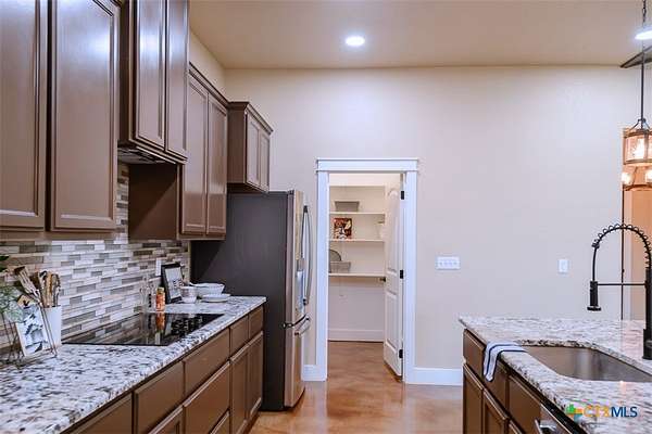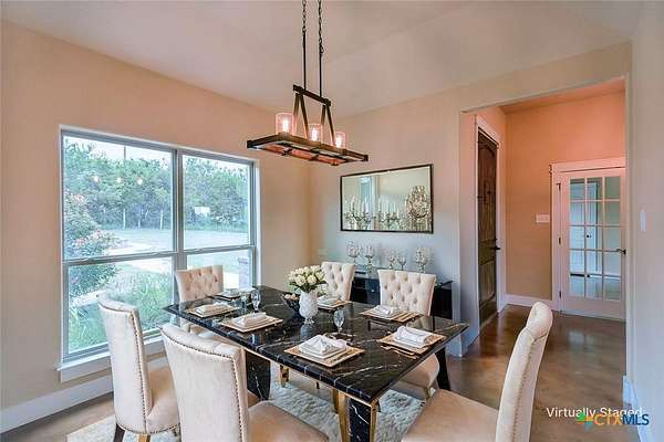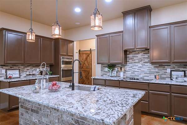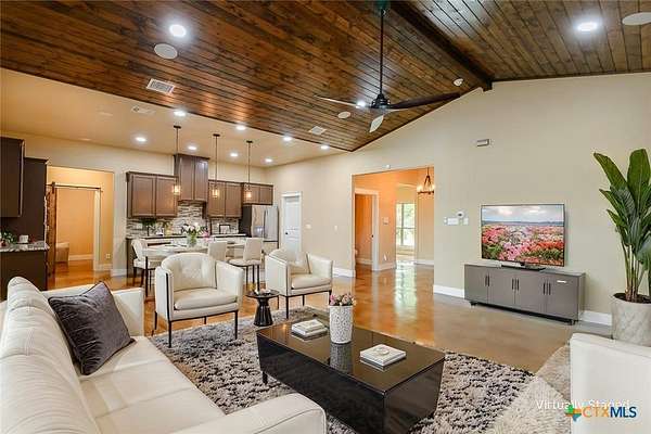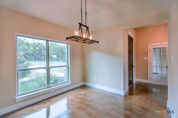 Set wide and open on 9 scenic acres, this property offers space to breathe, room to grow, and the comfort of a truly beautiful home. Fenced and cross-fenced, it's ideal for those who crave both function and freedom, whether for livestock, gardening, or simply spreading out under the Texas sky. A 40x30 carport and a 20x20 barn stand ready for your tools, toys, or weekend projects. From the moment you arrive, the colorful landscaping that frames the welcoming front porch sets the tone-this is a home with heart. Inside, the charm continues with stained concrete floors that run throughout, combining rustic warmth with everyday practicality. The great room is nothing short of stunning, featuring a raised wood ceiling with recessed lighting, a fireplace, and wide-open space that flows seamlessly into the island kitchen. With granite counters and a mosaic tile backsplash, the kitchen is both striking and functional-a place made for everything from weeknight meals to holiday feasts. Just off the kitchen, the dining room offers plenty of space for gathering. The owner's suite is a true retreat, with a tray ceiling trimmed in crown molding and a spa-inspired bath complete with a corner soaking tub, separate shower, and granite-topped double vanity. The home's thoughtful layout includes a spacious utility room with cabinets and countertop space, and a huge second living room perfect for movie nights, game days, or simply spreading out. Step outside to the covered back patio, where a wood ceiling and ceiling fan invite you to sit and stay a while. Whether you're watching the sunrise over the pasture or winding down under a sky full of stars, this space turns every moment into something special. This property is more than just a house on land-it's a place to plant roots, create memories, and enjoy the kind of peace that only wide-open space can offer.