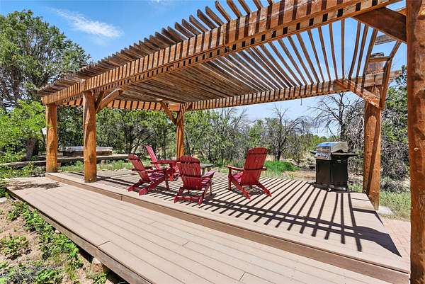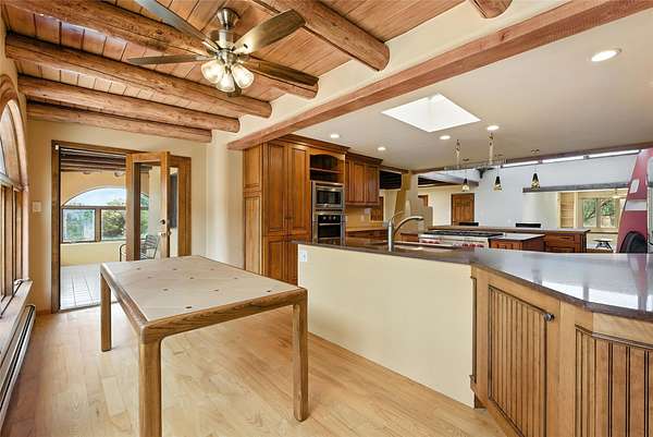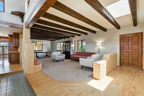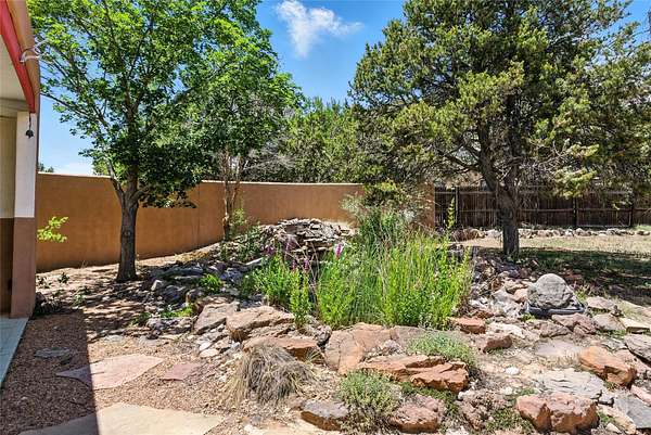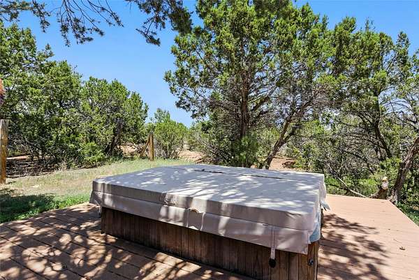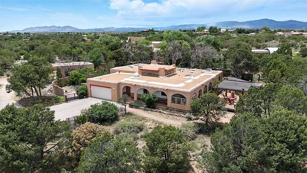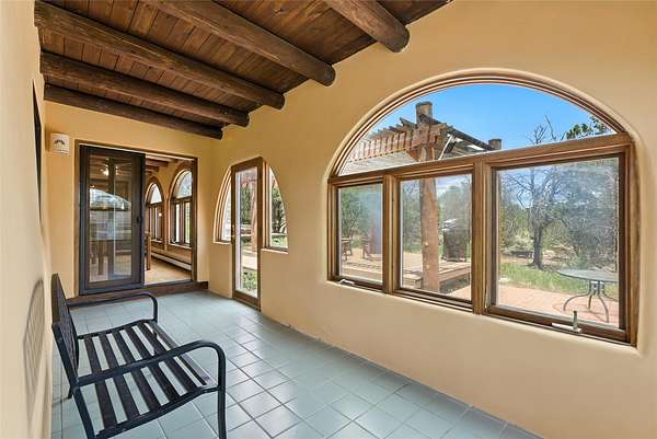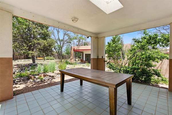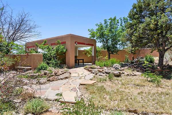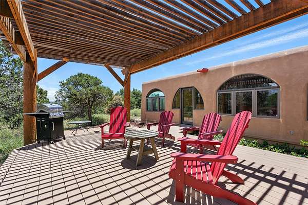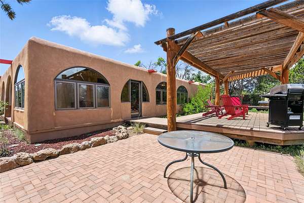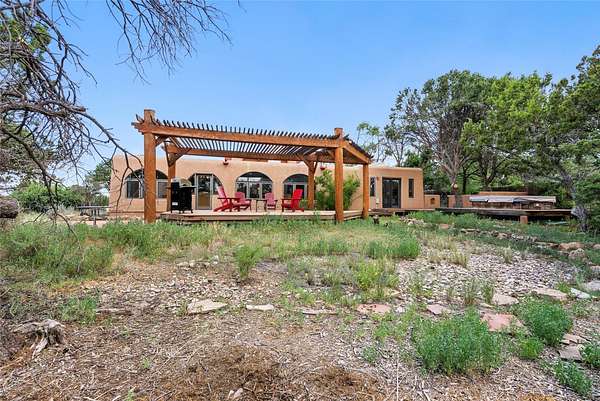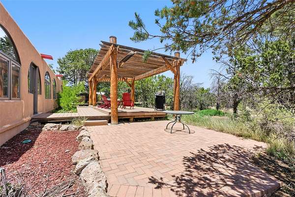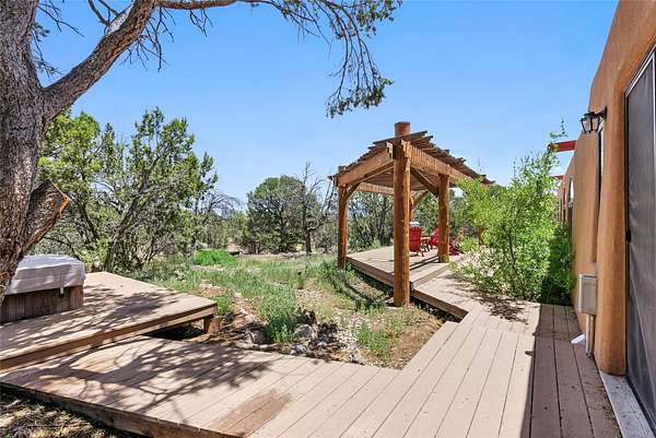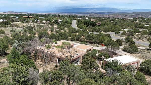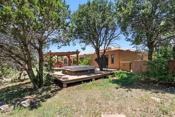 Tucked away on 2.18 peaceful, horse-zoned acres in the heart of White Rock, 123 La Senda is more than a home-it's a private retreat designed for those who value beauty, space, and connection to the land. With graceful portals wrapping three sides, lush gardens, and a tranquil backyard pond, this residence invites you to slow down and savor every season. Beyond the adobe-walled yard, native pinon and juniper trees stretch across the landscape, and equine trails wind through the neighborhood-perfect for morning rides, afternoon hikes, or sunset strolls under open skies. A composite-decked pergola creates a shaded outdoor lounge ideal for entertaining or unwinding in the fresh air. Whether dining alfresco or soaking in the hot tub, the outdoor living experience is both refined and serene. Inside, over 3,200 square feet of thoughtfully designed space showcases vaulted rough-hewn viga ceilings , 12 skylights, a classic kiva fireplace, and handcrafted bancos and nichos. Fresh paint in the common areas, new carpet, tile floors, and wood-framed windows enhance the sense of comfort and quality throughout. The custom kitchen features Brookhaven cabinetry, Bosch wall oven and microwave, Wolf 6-burner range, beverage fridge, dual pantries, two islands, and a matching tiled table. A bright sunroom offers additional space to relax year-round and a great greenhouse. The spacious primary suite includes private portal access, generous closet space, and a five-piece bath with jetted tub and dual-head walk-in shower beneath a skylight. Built-ins throughout the home include window seats and a curved living room couch that stays with the home-along with the spa-style hot tub. Additional highlights include a newer septic tank (installed in 2021), a two-car garage, detached RV carport, and direct access to neighborhood trails. Blending timeless style with modern comfort, 123 La Senda is a rare offering in one of White Rock's most peaceful and sought-after settings.