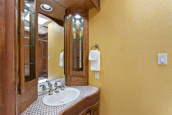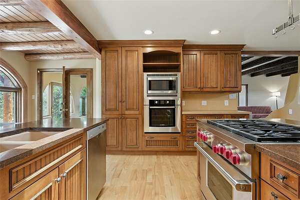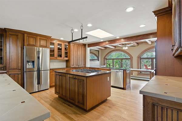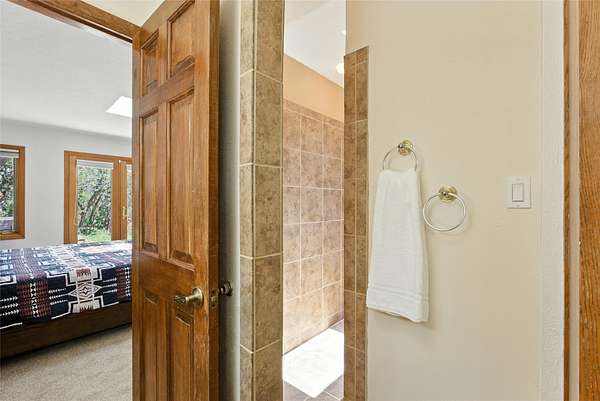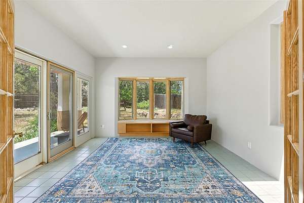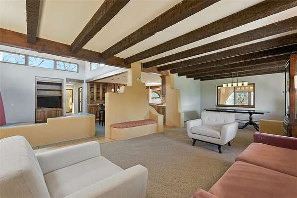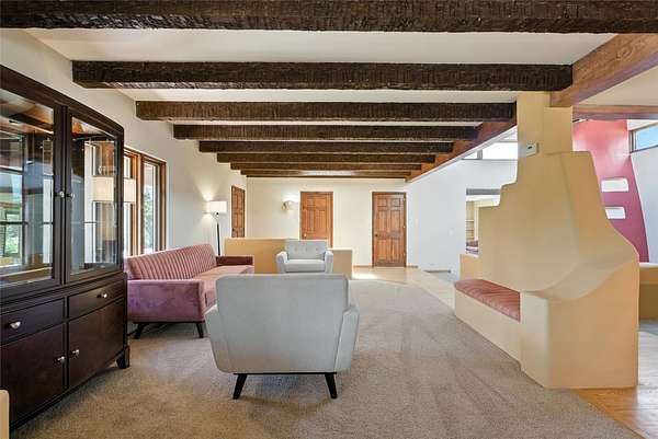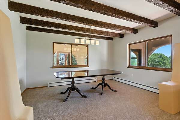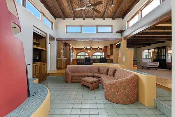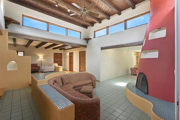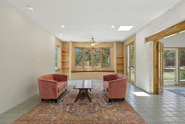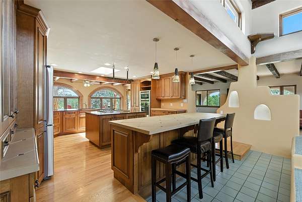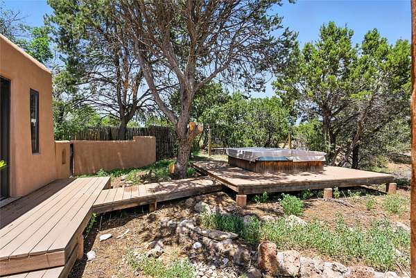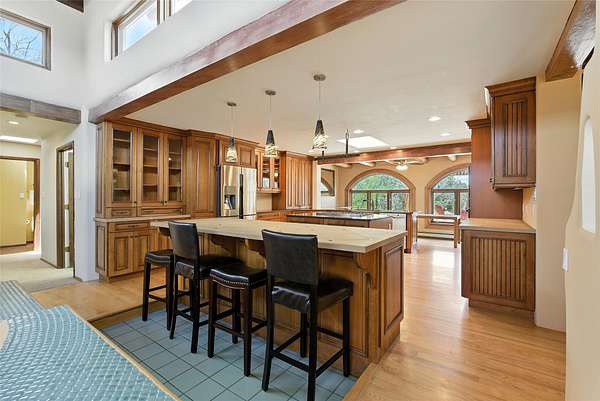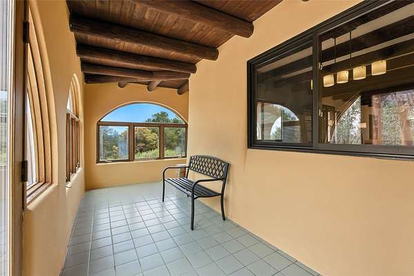 Tucked away on 2.18 peaceful, horse-zoned acres in the heart of White Rock, 123 La Senda is more than a home-it's a private retreat designed for those who value beauty, space, and connection to the land. With graceful portals wrapping three sides, lush gardens, and a tranquil backyard pond, this residence invites you to slow down and savor every season. Beyond the adobe-walled yard, native pinon and juniper trees stretch across the landscape, and equine trails wind through the neighborhood-perfect for morning rides, afternoon hikes, or sunset strolls under open skies. A composite-decked pergola creates a shaded outdoor lounge ideal for entertaining or unwinding in the fresh air. Whether dining alfresco or soaking in the hot tub, the outdoor living experience is both refined and serene. Inside, over 3,200 square feet of thoughtfully designed space showcases vaulted rough-hewn viga ceilings , 12 skylights, a classic kiva fireplace, and handcrafted bancos and nichos. Fresh paint in the common areas, new carpet, tile floors, and wood-framed windows enhance the sense of comfort and quality throughout. The custom kitchen features Brookhaven cabinetry, Bosch wall oven and microwave, Wolf 6-burner range, beverage fridge, dual pantries, two islands, and a matching tiled table. A bright sunroom offers additional space to relax year-round and a great greenhouse. The spacious primary suite includes private portal access, generous closet space, and a five-piece bath with jetted tub and dual-head walk-in shower beneath a skylight. Built-ins throughout the home include window seats and a curved living room couch that stays with the home-along with the spa-style hot tub. Additional highlights include a newer septic tank (installed in 2021), a two-car garage, detached RV carport, and direct access to neighborhood trails. Blending timeless style with modern comfort, 123 La Senda is a rare offering in one of White Rock's most peaceful and sought-after settings.