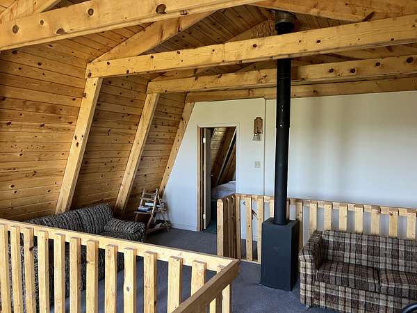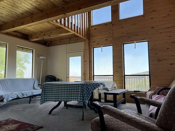 The property includes a cabin that serves as a base for recreation or seasonal use. The structure measures approximately 24 feet by 36 feet and provides roughly 1,120 square feet of living space across two levels. The cabin includes two bedrooms, one bathroom, and a loft area. Interior features include wood paneling along with a kitchen and dining area. Large floor-to-ceiling windows face the surrounding meadow and timbered landscape, providing natural light and views across the property.