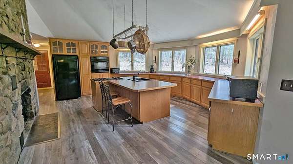 This one-of-a-kind custom Ranch is tucked well back from the road for exceptional privacy and was thoughtfully designed for its present owner. The stunning kitchen is truly the heart of the home, featuring a dramatic floor-to-ceiling stone fireplace, an expansive island with breakfast bar, an endless array of cabinets, and a built-in range with gas cooktop. The dining area flows seamlessly from the kitchen, perfect for everyday living and entertaining. Step down into the spacious yet inviting sunken living room, where a cathedral ceiling and an abundance of oversized windows frame serene, panoramic views of the surrounding natural landscape. The primary suite offers a charming bow window and a full bath complete with a relaxing whirlpool tub. A massive unfinished basement provides endless possibilities for future expansion or customization. Energy saving 2x6 construction. Outdoors, enjoy your own private retreat-complete with a deck overlooking a large patio and hot tub, all set within a secluded backyard. Don't miss this rare, distinctive Ranch home!