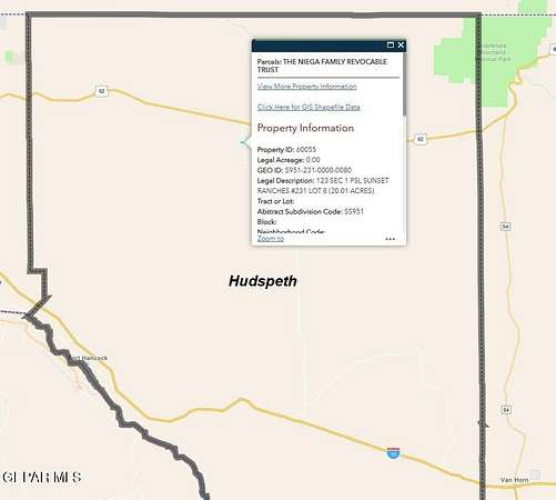 Est $184/moLocation! Location! Location! Why wait! Now is the time to own your own ranch in Texas. This stunning 20.02-acre property in the scenic Sunset Ranches Less that ! mile from paved FM2317 and 10 Min to the famous CORNUDAS CAFE (BEST BURGERS IN TEXAS) US HWY 62 is less than 5 minutes away. USE IMMEDIATELY FOR HOME SITE, R/V,RIDING HORSES. BEAUTIFUL MOUNTAIN VIEWS EVERYWHERE! offers the perfect escape into nature. Conveniently located just an hour and a half east of El Paso, and is a stone's throw away from the amazing hiking trails of Guadalupe Mountains National Park. Don't miss your chance to own this remarkable piece of Texas!''