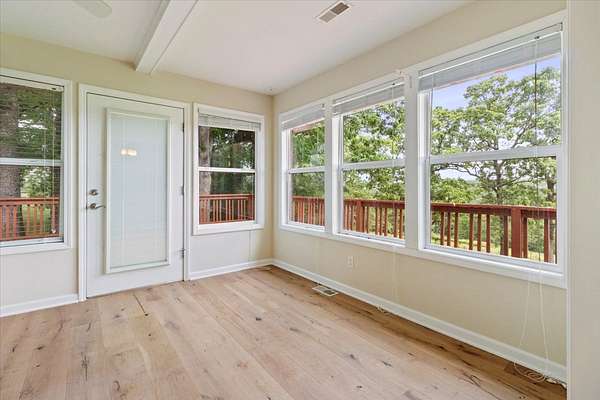 Vaulted ceilings, large windows, and a sunroom bring in natural light and stunning views