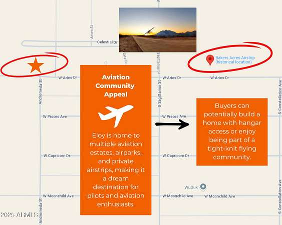 Elevate your lifestyle and join a community where the sky isn't the limit--it's your playground! Nestled in the serene and coveted Flying Crown Ranch neighborhood, this expansive 9.36-acre parcel presents a one-of-a-kind opportunity for home buyers, investors, and aviation enthusiasts alike. Imagine your own private hangar and direct access to a meticulously maintained runway, setting the stage for your next airborne adventure.This flat, vacant land parcel offers the tranquility and privacy of a gated community in a quaint aviation setting. Situated near the lively Sawtooth Airport and just a short hop from Skydive Arizona, this property is the perfect base for pilots and skydivers who crave the thrill of the open sky. Your new neighbors won't just be friendlythey'll share your passion for aviation. Embrace the spirit of the desert and the freedom of flight. Your runway to an extraordinary life awaits in this exceptional Arizona locale.