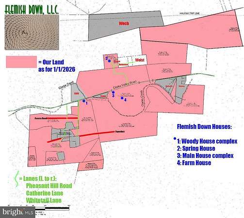 A rare opportunity to acquire an extraordinary legacy holding in Middle Paxton Township, Dauphin County known as Flemish Down LLC. This offering consists of approximately 777+/- contiguous acres across multiple tax parcels, featuring a unique blend of productive farmland, mature timber, mountain land, historic improvements, and approximately one mile of Clarks Creek frontage. The property includes four residential dwellings, all currently rented. The main house located at 1231 Clarks Valley Rd is a substantial historic structure with multiple wings; the west wing ( 3 bedrooms, 2.5 baths) is rented, while the center and east wings (approximately 6 bedrooms, 3 full baths, and 2 half baths) are retained by ownership. Two of the homes include barns. Additional residences include the farmhouse at 1241 Clarks Valley Road (3 bedrooms, 1 full and 1 half bath), the Woody House at 1061 Clarks Valley Road (3 bedrooms, 1 full and 1 half bath), and the Spring House at 1250 Whitetail Lane (3 bedrooms, 2 full baths). Beyond the residences, the property is richly improved with extensive agricultural and historic outbuildings, including approximately 12 stables, barns, an ice house, milk shed, chicken coop, workshop, silo, tractor shed, and additional support structures that reflect the property's long agricultural heritage. Land use is diversified and income-producing, with residential leases, farming leases, and hunting leases. The hunting leases are annual and expire June 1, 2026: the residential leases are month-to-month; the agriculture lease is partway through a five-year term and expire December 31, 2028. Portions of the forested acreage are managed under a Silviculture Plan, supporting long-term stewardship and sustainability. Flemish Down has been held by the same family for generations, with roots dating back over a century. Historically, portions of the original holdings have been conveyed to conservation organizations and public agencies, including lands now associated with State Game Lands, public conservation, and the Appalachian Trail corridor, underscoring the property's environmental and regional significance. This offering may appeal to conservation-minded buyers, family real estate trusts, timber companies, and public or quasi-public entities seeking large-scale land acquisition. Marketing will include exposure in the local MLS, commercial real estate platforms, and targeted outreach to qualified private and institutional buyers. Property consists of multiple parcels with varying characteristics, improvements, and encumbrances. Buyers are encouraged to conduct full due diligence regarding acreage, boundaries, leases, and land use restrictions. Shown by appointment only. DO NOT ATTEMPT TO ACCESS ANY PORTION OF THE PROPERTY WITHOUT AN APPROVED APPOINTMENT.