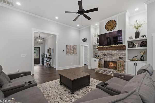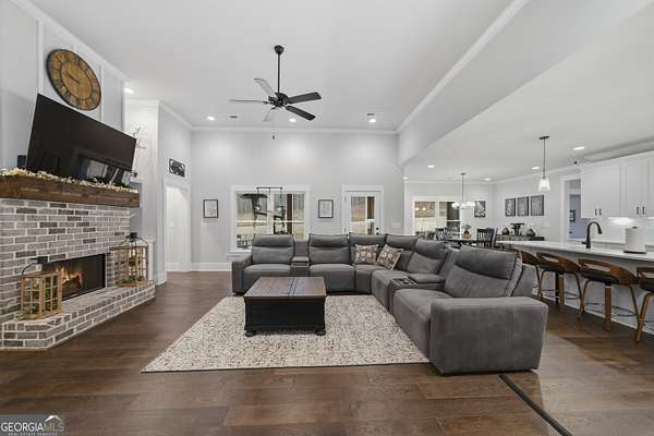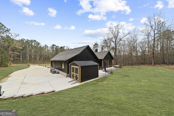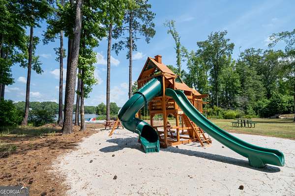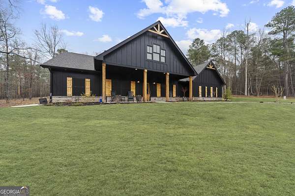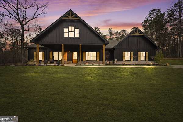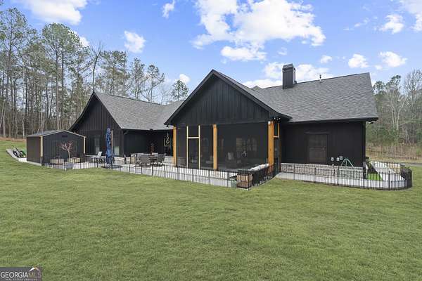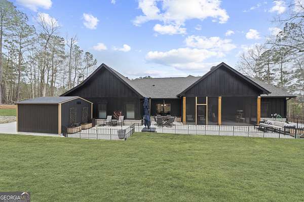 Stunning craftsman-style beauty located in the upscale gated community of Sailview at Lake Oconee. This home offers 4 bedrooms and 3 baths with a desirable split bedroom layout with a junior suite. The heart of the home is the custom kitchen complete with a large island and seating area, stainless steel appliances, soft-close cabinetry, upgraded lighting, and a spacious walk-in pantry. The kitchen flows seamlessly into the family room highlighted by 12ft ceilings and a brick fireplace anchored by built in floating shelves and cabinets, creating an inviting space for gathering and entertaining. A versatile flex room provides the perfect space for a home office, playroom, or additional living area. The spacious owner's ensuite offers dual vanities, a large tiled shower, and a huge walk-in closet that conveniently connects to the laundry and mudroom/drop zone. Additional features include engineered hardwood flooring, heavy trim and wide baseboards, lovely tiled bathrooms, and thoughtful storage throughout the home. Enjoy outdoor living on the covered screened rear porch overlooking the backyard and natural surroundings. The side entry two-car garage includes a generator ready/EV car changing 220. A 10 x 12 storage building provides additional space of tools and equipment. Peaceful privacy meets lake lifestyle in Sailview, where residents enjoy exclusive community amenities including community docks, a beach area, playground, scenic walking trails, and expansive green space and common areas. Conveniently located just minutes from Sugar Creek Marina and with easy access to I-20 at the Buckhead exit, this property offers both tranquility and accessibility to Madison, Athens, and Atlanta.