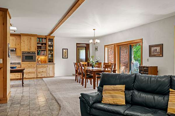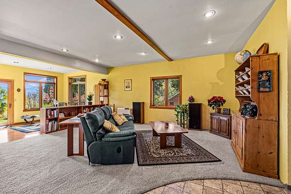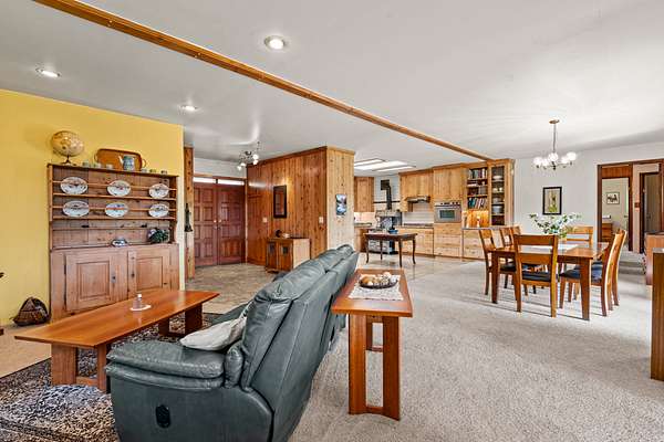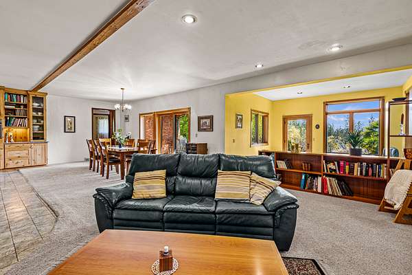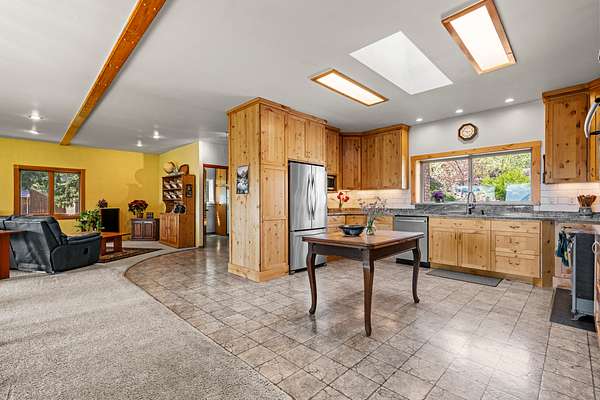 The main residence, built in 1973, is a well-maintained and thoughtfully designed home that embraces comfort and functionality. Offering approximately 2,500 square feet of living space across two levels, the home features an open-concept floor plan, updated kitchen with custom cabinetry and granite counters, and a wood-burning cooking stove in addition to modern electric appliances. The home includes four bedrooms, three full bathrooms, and generous storage areas. Durable construction materials such as concrete framing, stucco, and brick siding, paired with a metal roof, provide lasting quality in a rural setting. Recent updates include new windows installed in 2025.