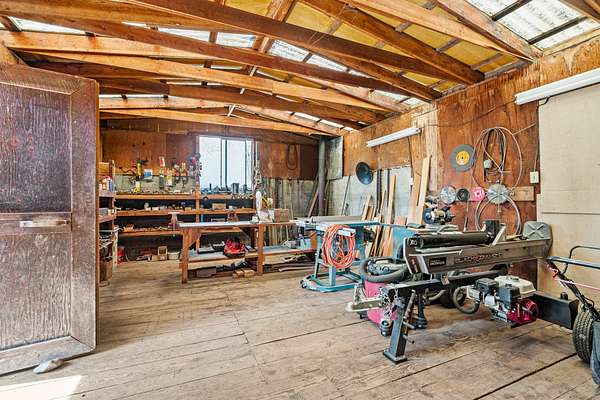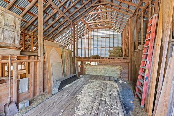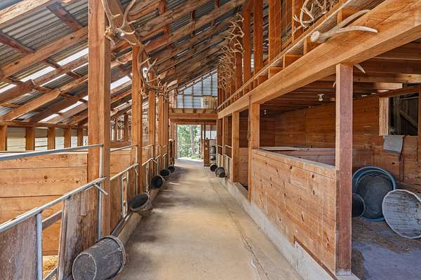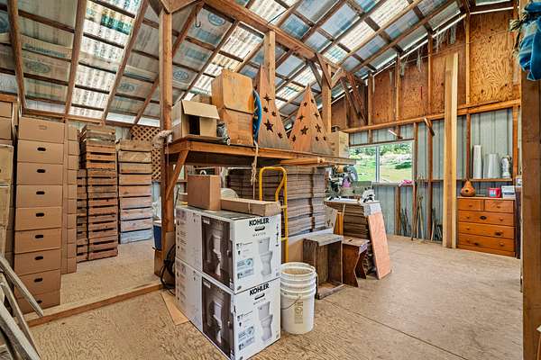 Supporting the agricultural and homesteading activities are several valuable outbuildings. The versatile farm building includes a workshop, storage room, insulated plant room, ODA-licensed farm kitchen, root cellar, and walk-in cooler. The historic equipment barn and livestock barn offer additional covered space for farming equipment, hay, or livestock operations, maintaining the property's authentic rural character.
