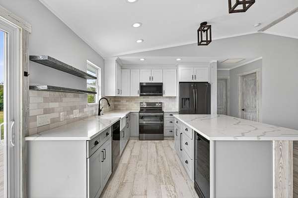 - High Ceilings, Kitchen Island, Split Bedroom Layout, Vaulted Ceiling(s)