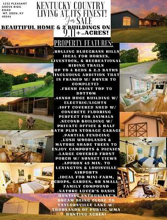 Welcome to your very own slice of heaven! Located in the rolling bluegrass hills of Anderson County Kentucky, this farm offers a beautiful ranch home, lush woodlands for great recreational riding trails, mature shade trees to enjoy your picnics on summer days, picturesque scenery, huge barn/building, second building with private office/half bath, and is in an excellent location being close to the very popular Taylorsville Lake where you will find thousands of public WMA hunting acres, public boat ramps, and state park, all for your enjoyment! This farm is partially fenced and the perfect place for your crops, garden, mini-farm, livestock, or small family compound! This charming home had a brand-new metal roof installed only 2 years ago and has just been freshly painted from top to bottom. A huge home addition has been framed/plumbing roughed in (with buyer to finish with their own special touches) and then the home will consist of a total of 4 bedrooms (PLUS the large office that is in a separate building!) and 2.5 bathrooms---addition includes a huge master bedroom suite, master bathroom with double vanity, laundry room, and three walk-in closets, with direct access to the extra-large covered porch where you can spend your mornings sipping your coffee and watching the sunrise. The huge 40X60 barn/building is ideal for storing your equipment, boat, and toys---plus there is an additional 10-foot covered overhang with concrete flooring that is great for your chicken coops, animal pens, or just a comfortable place to get out of the weather. A second building provides a perfect work from home set-up with private office and half bath plus the building has a separate garage area for storage. This is a nature lover's oasis and hunting enthusiast's dream while still only being only approximately 45 minutes from BOTH Lexington and Louisville airports! So grab your tree stands, pigs, chickens, sheep, goats, horses, cattle, and other farm friends and come enjoy country living at its finest! Call today! Please note: Inspirational photos have been included for furniture inspiration, decor inspiration, landscape inspiration, and to give a visual inspiration of what the home addition master bedroom could look like when finished out. ATV tour of the property can be provided with 24 hours notice (with pre-approval letter or proof of funds.) Buyer to verify schools.