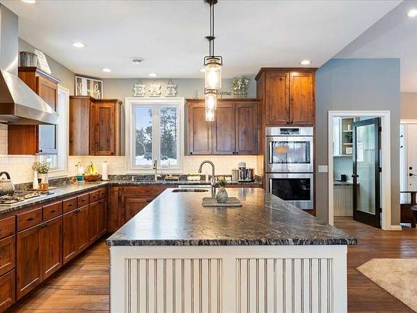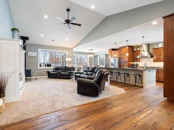 Garage amenities are equally impressive, with an oversized, heated two-car attached garage along with a secure safe room, plus a three-car detached garage, ideal for vehicles, lake toys, and equipment storage.